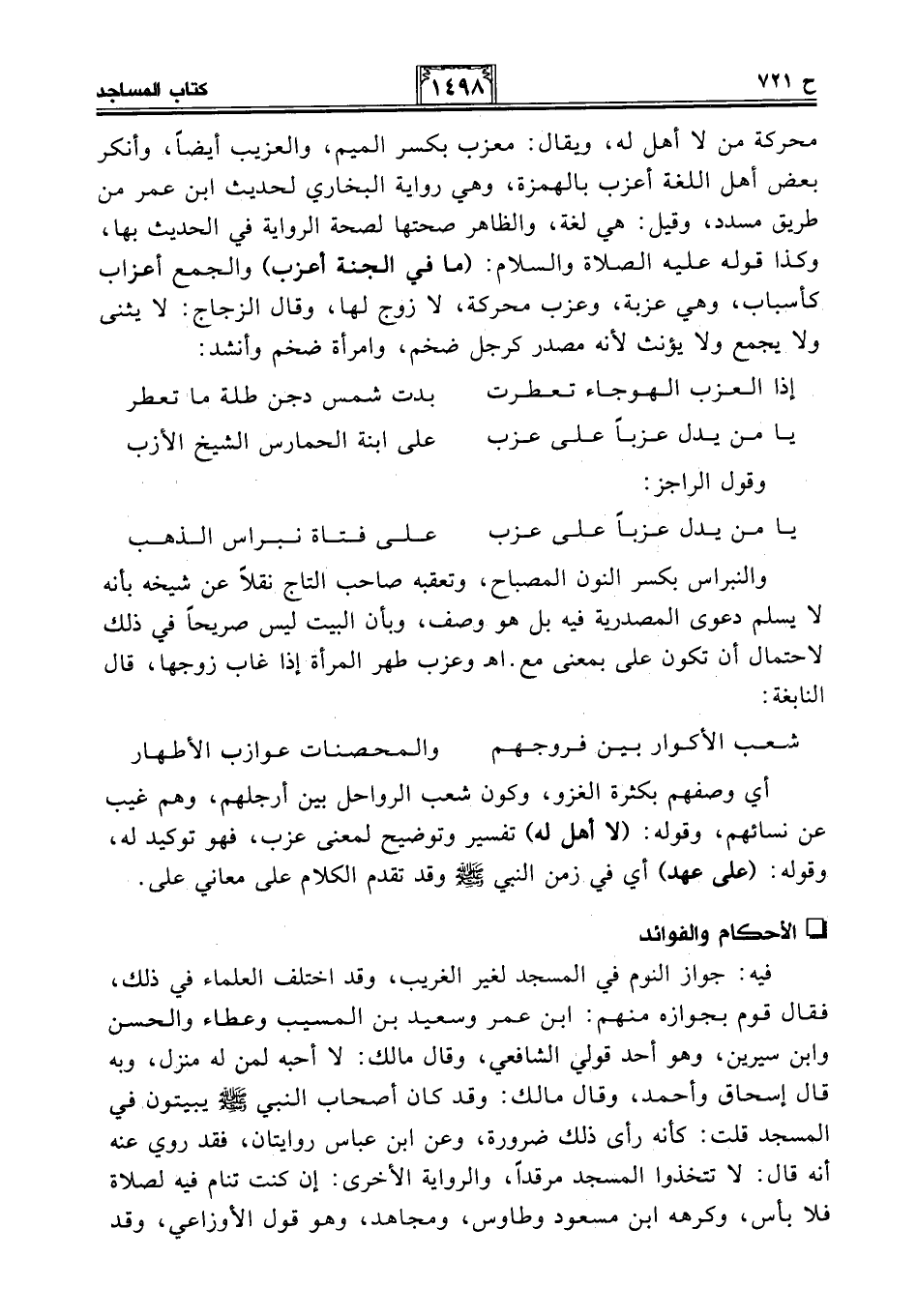فيه: جواز النوم في المسجد لغير الغريب، وقد اختلف العلماء في ذلك، فقال قوم بجوازه منهم: ابن عمر وسعيد بن المسيب وعطاء والحسن وابن سيرين، وهو أحد قولي الشافعي، وقال مالك: لا أحبه لمن له منزل، وبه قال إسحاق وأحمد، وقال مالك: وقد كان أصحاب النبي - صلى الله عليه وسلم - يبيتون في المسجد قلت: كأنه رأى ذلك ضرورة، وعن ابن عباس روايتان، فقد روي عنه أنه قال: لا تتخذوا المسجد مرقدًا، والرواية الأخرى: إن كنت تنام فيه لصلاة فلا بأس، وكرهه ابن مسعود وطاوس، ومجاهد، وهو قول الأوزاعي، وقد