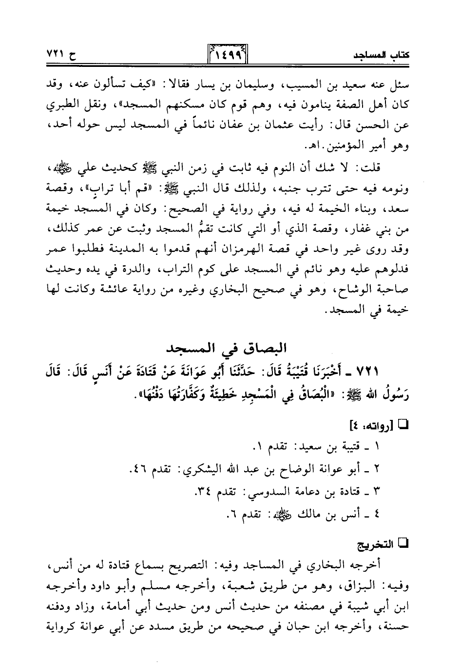 721 - أَخْبَرَنَا قُتَيْبَةُ قَالَ: حَدَّثَنَا أَبُو عَوَانَةَ عَنْ قَتَادَةَ عَنْ أَنَسٍ قَالَ: قَالَ رَسُولُ اللَّهِ - صلى الله عليه وسلم -: "الْبُصَاقُ فِي الْمَسْجِدِ خَطِيئَةٌ وَكَفَّارَتُهَا دَفْنُهَا".