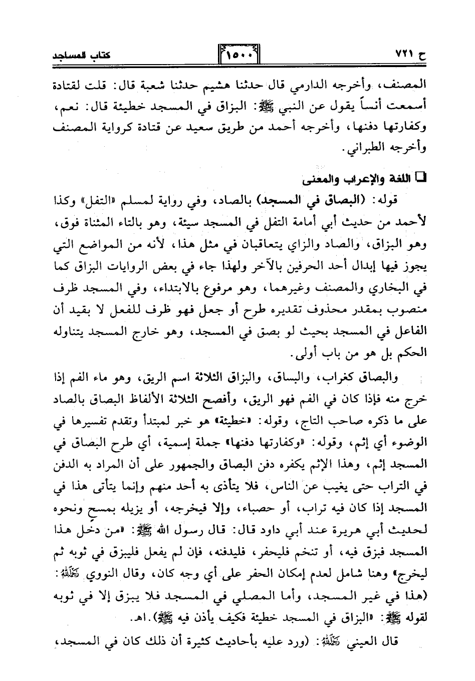 قوله: (البصاق في المسجد) بالصاد، وفي رواية لمسلم "التفل" وكذا لأحمد من حديث أبي أمامة التفل في المسجد سيئة، وهو بالتاء المثناة فوق، وهو البزاق، والصاد والزاي يتعاقبان في مثل هذا، لأنه من المواضع التي يجوز فيها إبدال أحد الحرفين بالآخر ولهذا جاء في بعض الروايات البزاق كما في البخاري والمصنف وغيرهما، وهو مرفوع بالابتداء، وفي المسجد ظرف منصوب بمقدر محذوف تقديره طرح أو جعل فهو ظرف للفعل لا بقيد أن الفاعل في المسجد بحيث لو بصق في المسجد، وهو خارج المسجد يتناوله الحكم بل هو من باب أولى.