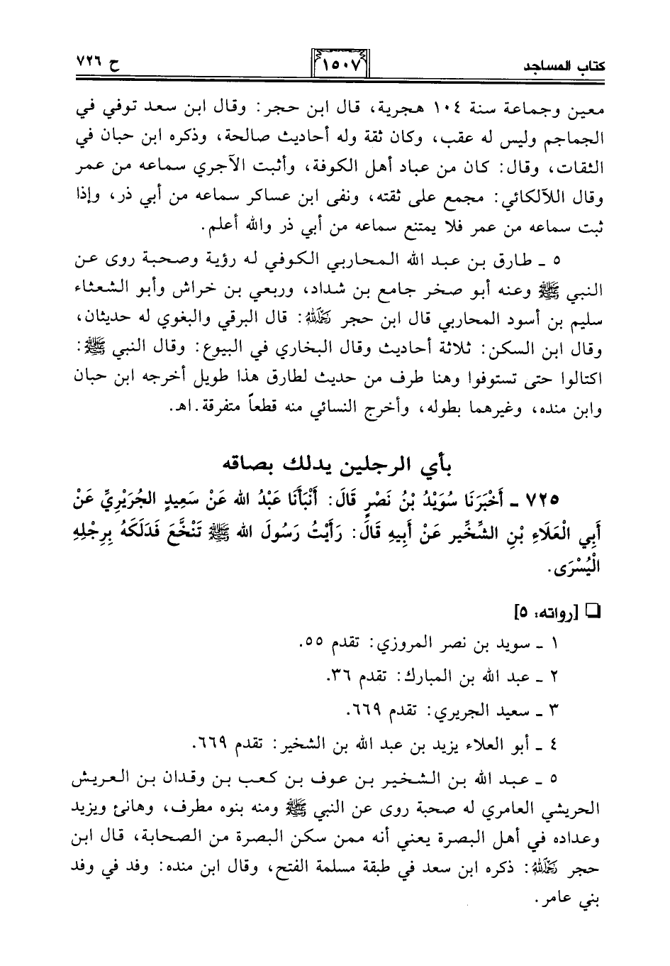 725 - أَخْبَرَنَا سُوَيْدُ بْنُ نَصْرٍ قَالَ: أَنْبَأَنَا عَبْدُ اللَّهِ عَنْ سَعِيدٍ الْجُرَيْرِيِّ عَنْ أَبِي الْعَلَاءِ بْنِ الشِّخِّيرِ عَنْ أَبِيهِ قَالَ: رَأَيْتُ رَسُولَ اللَّهِ - صلى الله عليه وسلم - تَنَخَّعَ فَدَلَكَهُ بِرِجْلِهِ الْيُسْرَى.