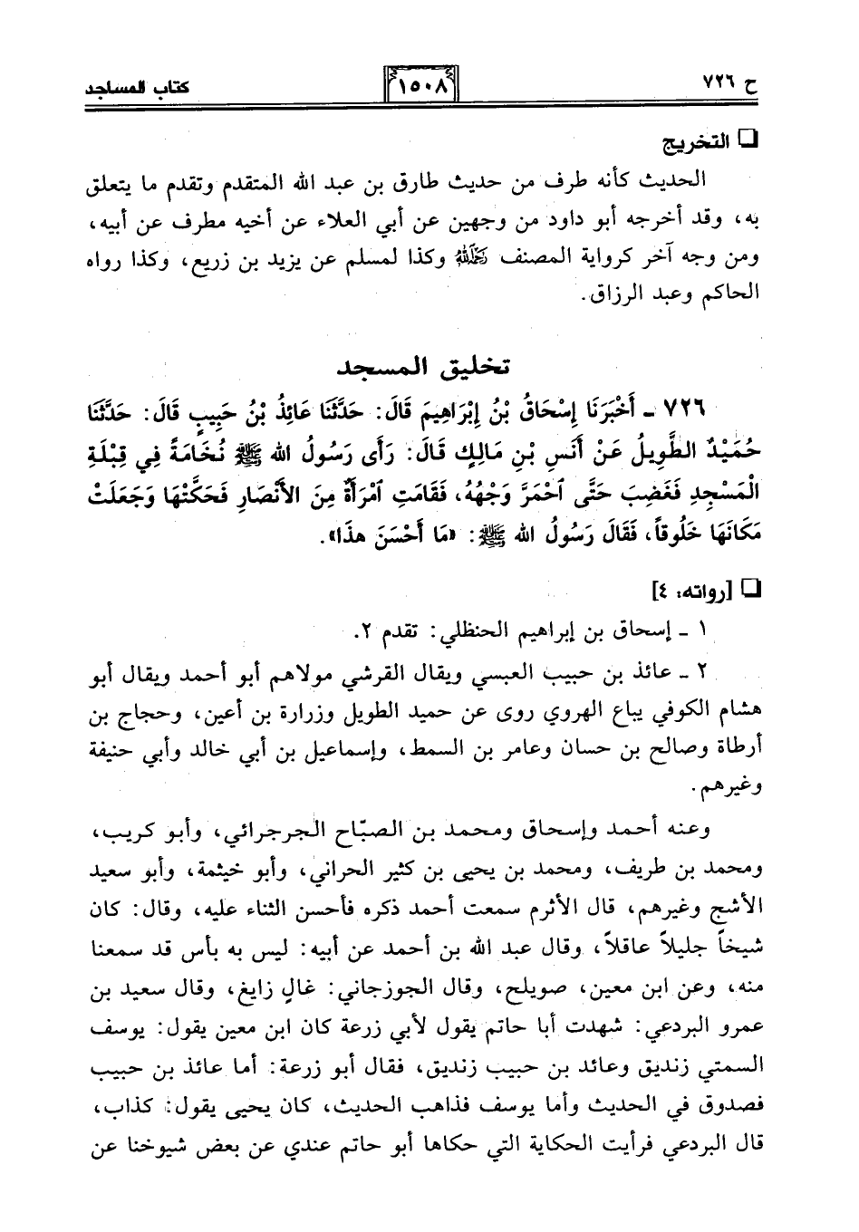 726 - أَخْبَرَنَا إِسْحَاقُ بْنُ إِبْرَاهِيمَ قَالَ: حَدَّثَنَا عَائِذُ بْنُ حَبِيبٍ قَالَ: حَدَّثَنَا حُمَيْدٌ الطَّوِيلُ عَنْ أَنَسِ بْنِ مَالِكٍ قَالَ: رَأَى رَسُولُ اللَّهِ - صلى الله عليه وسلم - نُخَامَةً فِي قِبْلَةِ الْمَسْجِدِ فَغَضِبَ حَتَّى احْمَرَّ وَجْهُهُ، فَقَامَتِ امْرَأَةٌ مِنَ الأَنْصَارِ فَحَكَّتْهَا وَجَعَلَتْ مَكَانَهَا خَلُوقًا، فَقَالَ رَسُولُ اللَّهِ - صلى الله عليه وسلم -: "مَا أَحْسَنَ هَذَا".