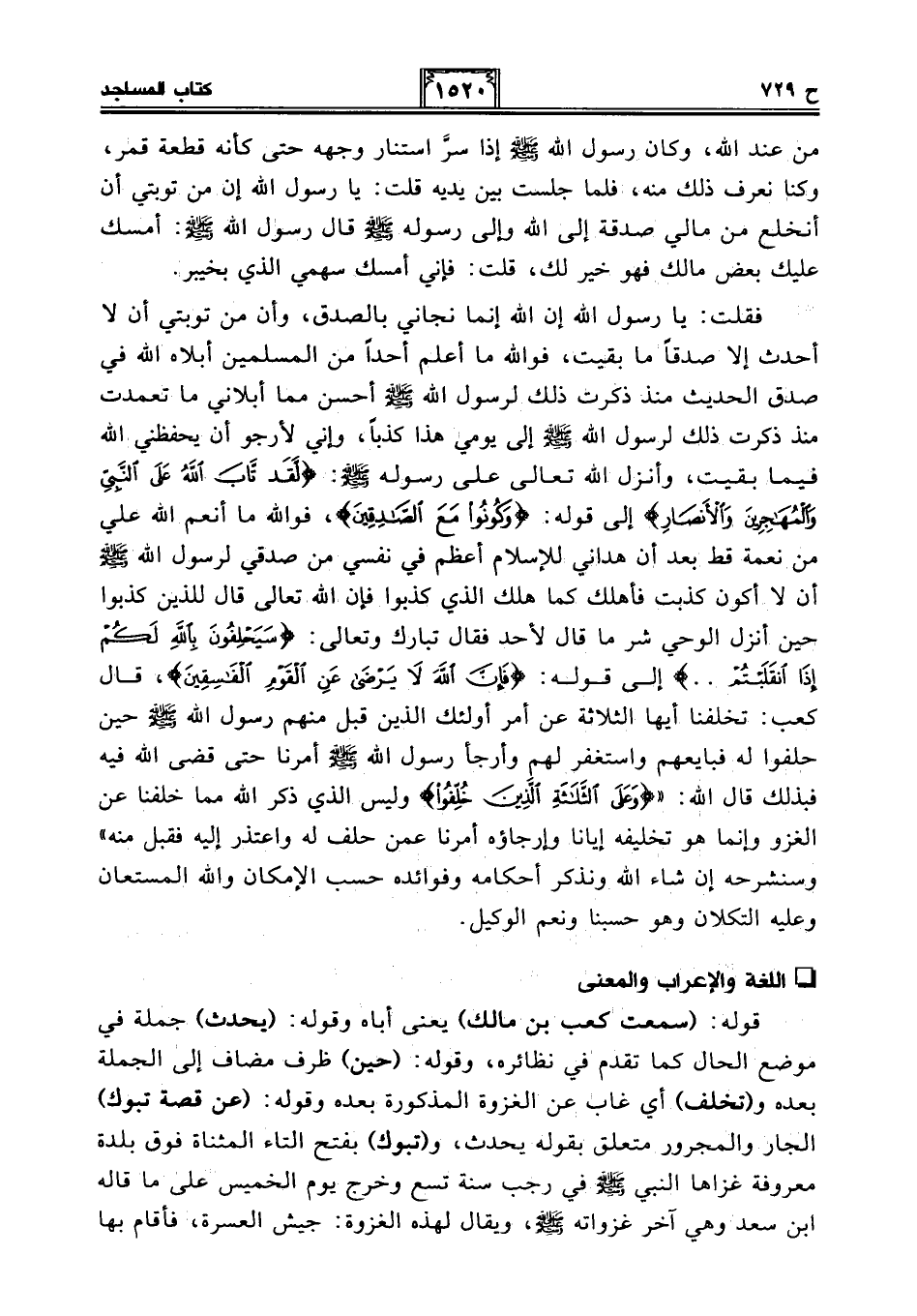 فقلت: يا رسول الله إن الله إنما نجاني بالصدق، وأن من توبتي أن لا أحدث إلا صدقًا ما بقيت، فوالله ما أعلم أحدًا من المسلمين أبلاه الله في صدق الحديث منذ ذكرت ذلك لرسول الله - صلى الله عليه وسلم - أحسن مما أبلاني ما تعمدت منذ ذكرت ذلك لرسول الله - صلى الله عليه وسلم - إلى يومي هذا كذبًا، وإني لأرجو أن يحفظني الله فيما بقيت، وأنزل الله تعالى على رسوله - صلى الله عليه وسلم -: {لَقَدْ تَابَ اللَّهُ عَلَى النَّبِيِّ وَالْمُهَاجِرِينَ وَالْأَنْصَارِ} إلى قوله: {وَكُونُوا مَعَ الصَّادِقِينَ}، فوالله ما أنعم الله علي من نعمة قط بعد أن هداني للإسلام أعظم في نفسي من صدقي لرسول الله - صلى الله عليه وسلم - أن لا أكون كذبت فأهلك كما هلك الذي كذبوا فإن الله تعالى قال للذين كذبوا حين أنزل الوحي شر ما قال لأحد فقال تبارك وتعالى: {سَيَحْلِفُونَ بِاللَّهِ لَكُمْ إِذَا انْقَلَبْتُمْ .. } إلى قوله: {فَإِنَّ اللَّهَ لَا يَرْضَى عَنِ الْقَوْمِ الْفَاسِقِينَ}، قال كعب: تخلفنا أيها الثلاثة عن أمر أولئك الذين قبل منهم رسول الله - صلى الله عليه وسلم - حين حلفوا له فبايعهم واستغفر لهم وأرجأ رسول الله - صلى الله عليه وسلم - أمرنا حتى قضى الله فيه فبذلك قال الله: {وَعَلَى الثَّلَاثَةِ الَّذِينَ خُلِّفُوا} وليس الذي ذكر الله مما خلفنا عن الغزو وإنما هو تخليفه إيانا وإرجاؤه أمرنا عمن حلف له واعتذر إليه فقبل منه" وسنشرحه إن شاء الله ونذكر أحكامه وفوائده حسب الإمكان والله المستعان وعليه التكلان وهو حسبنا ونعم الوكيل.