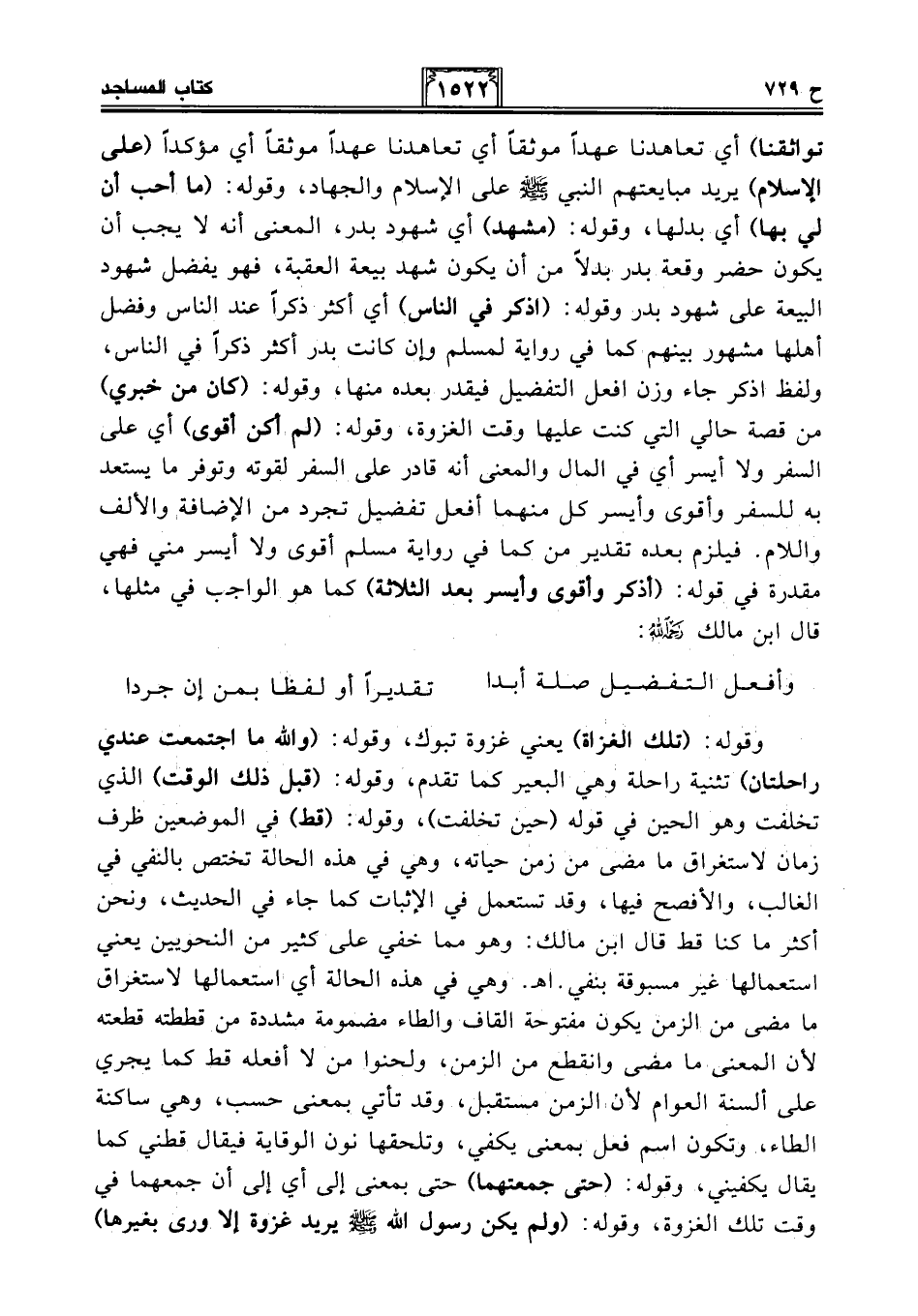 تواثقنا) أي تعاهدنا عهدًا موثقًا أي مؤكدًا (على الإِسلام) يريد مبايعتهم النبي - صلى الله عليه وسلم - على الإِسلام والجهاد، وقوله: (ما أحب أن لي بها) أي بدلها، وقوله: (مشهد) أي شهود بدر، المعنى أنه لا يجب أن يكون حضر وقعة بدر بدلًا من أن يكون شهد بيعة العقبة، فهو يفضل شهود البيعة على شهود بدر وقوله: (اذكر في الناس) أي أكثر ذكرًا عند الناس وفضل أهلها مشهور بينهم كما في رواية لمسلم وإن كانت بدر أكثر ذكرًا في الناس، ولفظ اذكر جاء وزن افعل التفضيل فيقدر بعده منها، وقوله: (كان من خبري) من قصة حالي التي كنت عليها وقت الغزوة، وقوله: (لم أكن أقوى) أي على السفر ولا أيسر أي في المال والمعنى أنه قادر على السفر لقوته وتوفر ما يستعد به للسفر وأقوى وأيسر كل منهما أفعل تفضيل تجرد من الإضافة والألف واللام. فيلزم بعده تقدير من كما في رواية مسلم أقوى ولا أيسر مني فهي مقدرة في قوله: (أذكر وأقوى وأيسر بعد الثلاثة) كما هو الواجب في مثلها، قال ابن مالك -رحمه الله-: