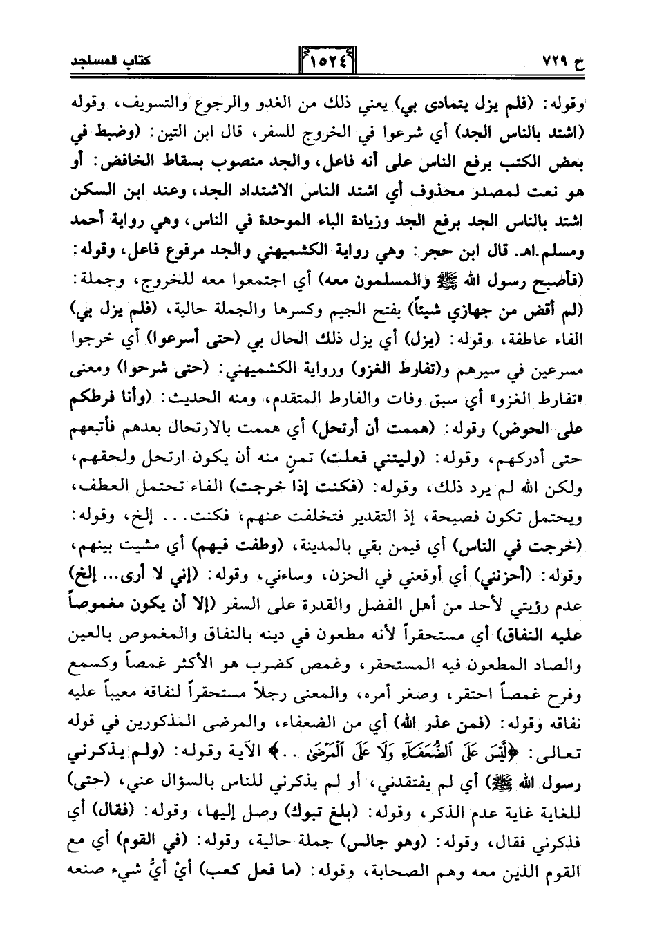 وقوله: (فلم يزل يتمادى بي) يعني ذلك من الغدو والرجوع والتسويف، وقوله (اشتد بالناس الجد) أي شرعوا في الخروج للسفر، قال ابن التين: (وضبط في بعض الكتب برفع الناس على أنه فاعل، والجد منصوب بسقاط الخافض: أو هو نعت لمصدر محذوف أي اشتد الناس الاشتداد الجد، وعند ابن السكن اشتد بالناس الجد برفع الجد وزيادة الباء الموحدة في الناس، وهي رواية أحمد ومسلم. اهـ. قال ابن حجر: وهي رواية الكشميهني والجد مرفوع فاعل، وقوله: (فأصبح رسول الله - صلى الله عليه وسلم - والمسلمون معه) أي اجتمعوا معه للخروج، وجملة: (لم أقض من جهازي شيئًا) بفتح الجيم وكسرها والجملة حالية، (فلم يزل بي) الفاء عاطفة، وقوله: (يزل) أي يزل ذلك الحال بي (حتى أسرعوا) أي خرجوا مسرعين في سيرهم و (تفارط الغزو) ورواية الكشميهني: (حتى شرحوا) ومعنى "تفارط الغزو" أي سبق وفات والفارط المتقدم، ومنه الحديث: (وأنا فرطكم على الحوض) وقوله: (هممت أن أرتحل) أي هممت بالارتحال بعدهم فأتبعهم حتى أدركهم، وقوله: (وليتني فعلت) تمنٍ منه أن يكون ارتحل ولحقهم، ولكن الله لم يرد ذلك، وقوله: (فكنت إذا خرجت) الفاء تحتمل العطف، ويحتمل تكون فصيحة، إذ التقدير فتخلفت عنهم، فكنت. . . إلخ، وقوله: (خرجت في الناس) أي فيمن بقي بالمدينة، (وطفت فيهم) أي مشيت بينهم، وقوله: (أحزنني) أي أوقعني في الحزن، وساءني، وقوله: (إني لا أرى. . . إلخ) عدم رؤيتي لأحد من أهل الفضل والقدرة على السفر (إلا أن يكون مغموصًا عليه النفاق) أي مستحقرًا لأنه مطعون في دينه بالنفاق والمغموص بالعين والصاد المطعون فيه المستحقر، وغمص كضرب هو الأكثر غمصًا وكسمع وفرح غمصًا احتقر، وصغر أمره، والمعنى رجلًا مستحقرًا لنفاقه معيبًا عليه نفاقه وقوله: (فمن عذر الله) أي من الضعفاء, والمرضى المذكورين في قوله تعالى: {لَيْسَ عَلَى الضُّعَفَاءِ وَلَا عَلَى الْمَرْضَى .. } الآية وقوله: (ولم يذكرني رسول الله - صلى الله عليه وسلم -) أي لم يفتقدني، أو لم يذكرني للناس بالسؤال عني، (حتى) للغاية غاية عدم الذكر، وقوله: (بلغ تبوك) وصل إليها، وقوله: (فقال) أي فذكرني فقال، وقوله: (وهو جالس) جملة حالية، وقوله: (في القوم) أي مع القوم الذين معه وهم الصحابة، وقوله: (ما فعل كعب) أيْ أيُّ شيء صنعه