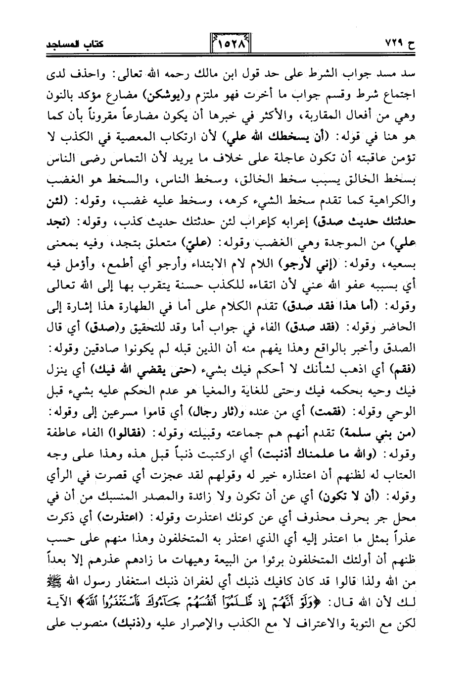 سد مسد جواب الشرط على حد قول ابن مالك رحمه الله تعالى: واحذف لدى اجتماع شرط وقسم جواب ما أخرت فهو ملتزم و (يوشكن) مضارع مؤكد بالنون وهي من أفعال المقاربة، والأكثر في خبرها أن يكون مضارعًا مقرونًا بأن كما هو هنا في قوله: (أن يسخطك الله علي) لأن ارتكاب المعصية في الكذب لا تؤمن عاقبته أن تكون عاجلة على خلاف ما يريد لأن التماس رضى الناس بسخط الخالق يسبب سخط الخالق، وسخط الناس، والسخط هو الغضب والكراهية كما تقدم سخط الشيء كرهه، وسخط عليه غضب، وقوله: (لئن حدثتك حديث صدق) إعرابه كإعراب لئن حدثتك حديث كذب، وقوله: (تجد علي) من الموجدة وهي الغضب وقوله: (عليّ) متعلق بتجد، وفيه بمعنى بسعيه، وقوله: (إني لأرجو) اللام لام الابتداء وأرجو أي أطمع، وأؤمل فيه أي بسببه عفو الله عني لأن اتقاءه للكذب حسنة يتقرب بها إلى الله تعالى وقوله: (أما هذا فقد صدق) تقدم الكلام على أما في الطهارة هذا إشارة إلى الحاضر وقوله: (فقد صدق) الفاء في جواب أما وقد للتحقيق و (صدق) أي قال الصدق وأخبر بالواقع وهذا يفهم منه أن الذين قبله لم يكونوا صادقين وقوله: (فقم) أي اذهب لشأنك لا أحكم فيك بشيء (حتى يقضي الله فيك) أي ينزل فيك وحيه بحكمه فيك وحتى للغاية والمغيا هو عدم الحكم عليه بشيء قبل الوحي وقوله: (فقمت) أي من عنده و (ثار رجال) أي قاموا مسرعين إلي وقوله: (من بني سلمة) تقدم أنهم هم جماعته وقبيلته وقوله: (فقالوا) الفاء عاطفة وقوله: (والله ما علمناك أذنبت) أي ارتكبت ذنبًا قبل هذه وهذا على وجه العتاب له لظنهم أن اعتذاره خير له وقولهم لقد عجزت أي قصرت في الرأي وقوله: (أن لا تكون) أي عن أن تكون ولا زائدة والمصدر المنسبك من أن في محل جر بحرف محذوف أي عن كونك اعتذرت وقوله: (اعتذرت) أي ذكرت عذرًا بمثل ما اعتذر إليه أي الذي اعتذر به المتخلفون وهذا منهم على حسب ظنهم أن أولئك المتخلفون برئوا من البيعة وهيهات ما زادهم عذرهم إلا بعدًا من الله ولذا قالوا قد كان كافيك ذنبك أي لغفران ذنبك استغفار رسول الله - صلى الله عليه وسلم - لك لأن الله قال: {وَلَوْ أَنَّهُمْ إِذْ ظَلَمُوا أَنْفُسَهُمْ جَاءُوكَ فَاسْتَغْفَرُوا اللَّهَ} الآية لكن مع التوبة والاعتراف لا مع الكذب والإصرار عليه و (ذنبك) منصوب على