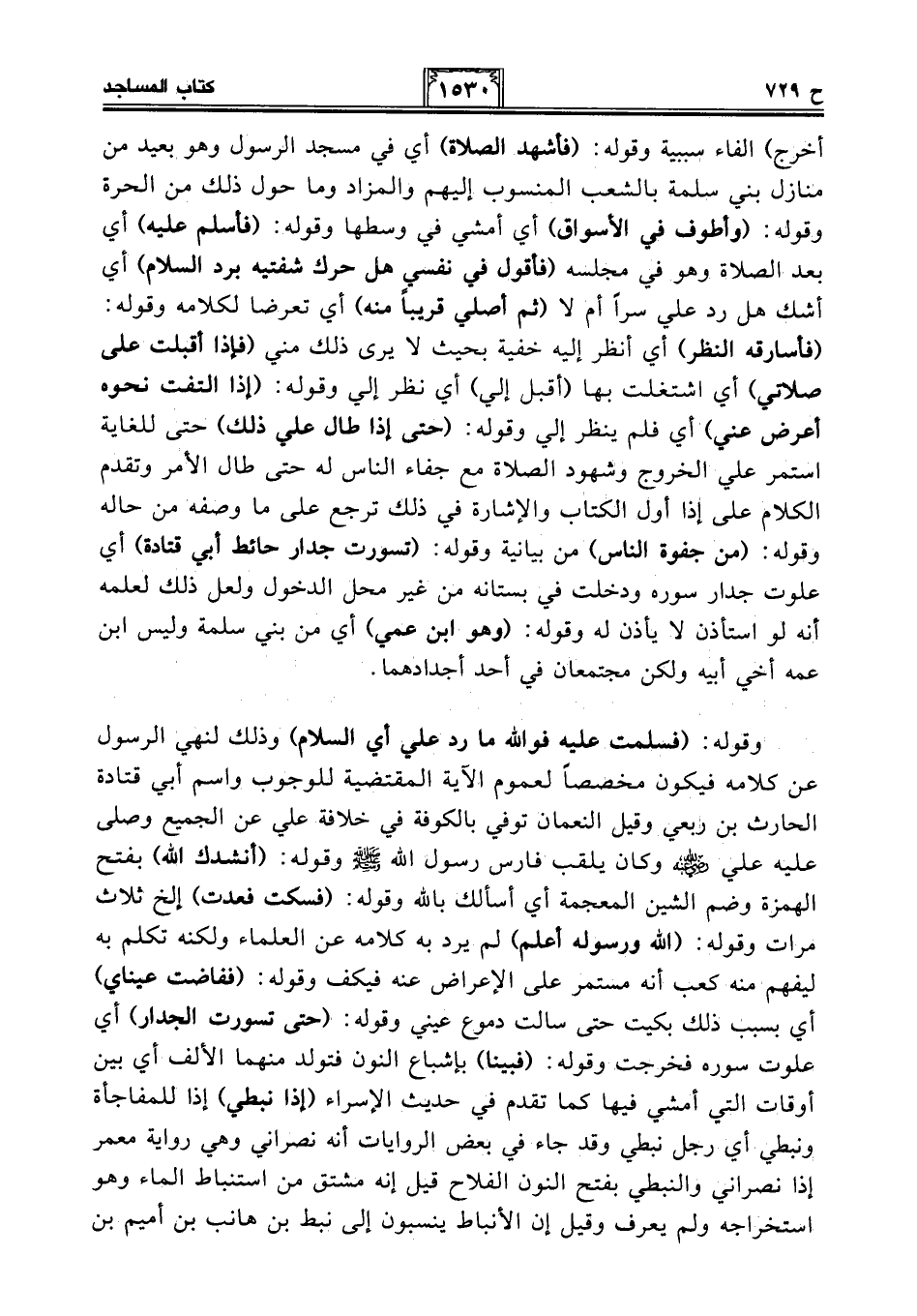 أخرج) الفاء سببية وقوله: (فأشهد الصلاة) أي في مسجد الرسول وهو بعيد من منازل بني سلمة بالشعب المنسوب إليهم والمزاد وما حول ذلك من الحرة وقوله: (وأطوف في الأسواق) أي أمشي في وسطها وقوله: (فأسلم عليه) أي بعد الصلاة وهو في مجلسه (فأقول في نفسي حرك شفتيه برد السلام) أي أشك هل رد علي سرًا أم لا (ثم أصلي قريبًا منه) أي تعرضا لكلامه وقوله: (فأسارقه النظر) أي أنظر إليه خفية بحيث لا يرى ذلك مني (فإذا أقبلت على صلاتي) أي اشتغلت بها (أقبل إلي) أي نظر إلي وقوله: (إذا التفت نحوه أعرض عني) أي فلم ينظر إلي وقوله: (حتى إذا طال علي ذلك) حتى للغاية استمر علي الخروج وشهود الصلاة مع جفاء الناس له حتى طال الأمر وتقدم الكلام على إذا أول الكتاب والإشارة في ذلك ترجع على ما وصفه من حاله وقوله: (من جفوة الناس) من بيانية وقوله: (تسورت جدار حائط أبي قتادة) أي علوت جدار سوره ودخلت في بستانه من غير محل الدخول ولعل ذلك لعلمه أنه لو استأذن لا يأذن له وقوله: (وهو ابن عمي) أي من بني سلمة وليس ابن عمه أخي أبيه ولكن مجتمعان في أحد أجدادهما.