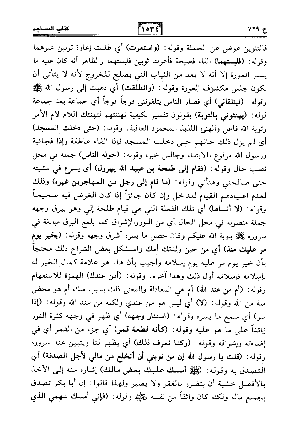 فالتنوين عوض عن الجملة وقوله: (واستعرت) أي طلبت إعارة ثوبين غيرهما وقوله: (فلبستهما) الفاء فصيحة فأعرت ثوبين فلبستهما والظاهر أنه كان عليه ما يستر العورة إلا أنه لا يعد من الثياب التي يصلح للخروج لأنه لا يتأتى أن يكون جلس مكشوف العورة وقوله: (وانطلقت) أي ذهبت إلى رسول الله - صلى الله عليه وسلم - وقوله: (فيتلقاني) أي فصار الناس يتلقونني فوجًا فوجًا أي جماعة بعد جماعة قوله: (يهنئوني بالتوبة) يقولون تفسير لكيفية تهنئتهم لتهنئك اللام لام الأمر وتوبة الله فاعل والهنئ اللذيذ المحمود العاقبة. وقوله: (حتى دخلت المسجد) أي لم يزل ذلك حالهم حتى دخلت المسجد فإذا الفاء عاطفة وإذا فجائية ورسول الله مرفوع بالابتداء وجالس خبره وقوله: (حوله الناس) جملة في محل نصب حال وقوله: (فقام إلى طلحة بن عبيد الله يهرول) أي يسرع في مشيته حتى صافحني وهنأني وقوله: (ما قام إلى رجل من المهاجرين غيره) وذلك لعدم اعتيادهم القيام للداخل وإن كان جائزًا إذا كان الغرض فيه صحيحًا وقوله: (لا أنساها) أي تلك الفعلة التي هي قيام طلحة إلي وهو بيرق وجهه جملة منصوبة في محل الحال أي من النور والإشراق كما يلمع البرق مبالغة في سروره - صلى الله عليه وسلم - بتوبة الله عليكم وكان حصل ما يسره أشرق وجهه وقوله: (بخير يوم مر عليك منذ) أي من حين ولدتك أمك واستشكل بعض الشراح ذلك محتجًا بأن خير يوم مر عليه يوم إسلامه وأجيب بأن هذا هو علامة كمال الخير له بإسلامه فإسلامه أول ذلك وهذا آخره. وقوله: (أمن عندك) الهمزة للاستفهام وقوله: (أم من عند الله) أم هي المعادلة والمعنى ذلك بسبب منك أم هو محض منة من الله وقوله: (لا) أي ليس هو من عندي ولكنه من عند الله وقوله: (إذا سر) أي سمع ما يسره وقوله: (استنار وجهه) أي ظهر في وجهه كثرة النور زائدًا على ما هو عليه وقوله: (كأنه قطعة قمر) أي جزء من القمر أي في إضاءته وإشراقه وقوله: (وكنا نعرف ذلك) أي يظهر لنا ويتبين عند سروره وقوله: (قلت يا رسول الله إن من توبتي أن أنخلع من مالي لأجل الصدقة) أي التصدق به وقوله: (- صلى الله عليه وسلم - أمسك عليك بعض مالك) إشارة منه إلى الأخذ بالأفضل خشية أن يتضرر بالفقر ولا يصبر ولهذا قالوا: إن أبا بكر تصدق بجميع ماله ولكنه كان واثقًا من نفسه - رضي الله عنه - وقوله: (فإني أمسك سهمي الذي