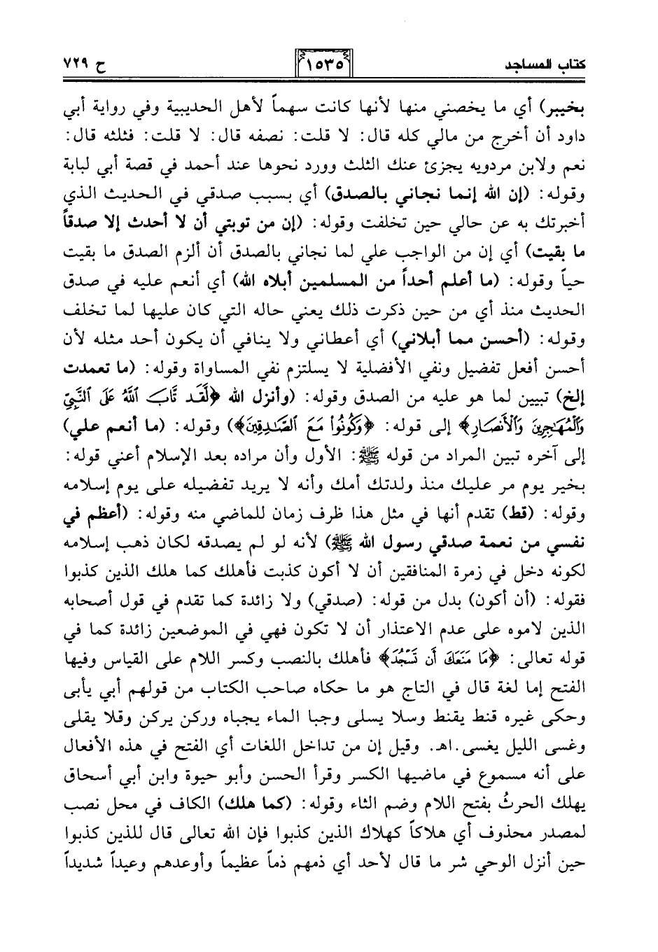 بخيبر) أي ما يخصني منها لأنها كانت سهمًا لأهل الحديبية وفي رواية أبي داود أن أخرج من مالي كله قال: لا قلت: نصفه قال: لا قلت: فثلثه قال: نعم ولابن مردويه يجزئ عنك الثلث وورد نحوها عند أحمد في قصة أبي لبابة وقوله: (إن الله إنما نجاني بالصدق) أي بسبب صدقي في الحديث الذي أخبرتك به عن حالي حين تخلفت وقوله: (إن من توبتي أن لا أحدث إلا صدقًا ما بقيت) أي إن من الواجب علي لما نجاني بالصدق أن ألزم الصدق ما بقيت حيًا وقوله: (ما أعلم أحدًا من المسلمين أبلاه الله) أي أنعم عليه في صدق الحديث منذ أي من حين ذكرت ذلك يعني حاله التي كان عليها لما تخلف وقوله: (أحسن مما أبلاني) أي أعطاني ولا ينافي أن يكون أحد مثله لأن أحسن أفعل تفضيل ونفي الأفضلية لا يستلزم نفي المساواة وقوله: (ما تعمدت إلخ) تبيين لما هو عليه من الصدق وقوله: (وأنزل الله {لَقَدْ تَابَ اللَّهُ عَلَى النَّبِيِّ وَالْمُهَاجِرِينَ وَالْأَنْصَارِ} إلى قوله: {وَكُونُوا مَعَ الصَّادِقِينَ}) وقوله: (ما أنعم علي) إلى آخره تبين المراد من قوله - صلى الله عليه وسلم -: الأول وأن مراده بعد الإِسلام أعني قوله: بخير يوم مر عليك منذ ولدتك أمك وأنه لا يريد تفضيله على يوم إسلامه وقوله: (قط) تقدم أنها في مثل هذا ظرف زمان للماضي منه وقوله: (أعظم في نفسي من نعمة صدقي رسول الله - صلى الله عليه وسلم -) لأنه لو لم يصدقه لكان ذهب إسلامه لكونه دخل في زمرة المنافقين أن لا أكون كذبت فأهلك كما هلك الذين كذبوا فقوله: (أن أكون) بدل من قوله: (صدقي) ولا زائدة كما تقدم في قول أصحابه الذين لاموه على عدم الاعتذار أن لا تكون فهي في الموضعين زائدة كما في قوله تعالى: {مَا مَنَعَكَ أَنْ تَسْجُدَ} فأهلك بالنصب وكسر اللام على القياس وفيها الفتح إما لغة قال في التاج هو ما حكاه صاحب الكتاب من قولهم أبي يأبى وحكى غيره قنط يقنط وسلا يسلى وجبا الماء يجباه وركن يركن وقلا يقلى وغسى الليل يغسى. اهـ. وقيل إن من تداخل اللغات أي الفتح في هذه الأفعال على أنه مسموع في ماضيها الكسر وقرأ الحسن وأبو حيوة وابن أبي إسحاق يهلك الحرثُ بفتح اللام وضم الثاء وقوله: (كما هلك) الكاف في محل نصب لمصدر محذوف أي هلاكًا كهلاك الذين كذبوا فإن الله تعالى قال للذين كذبوا حين أنزل الوحي شر ما قال لأحد أي ذمهم ذمًا عظيمًا وأوعدهم وعيدًا شديدًا