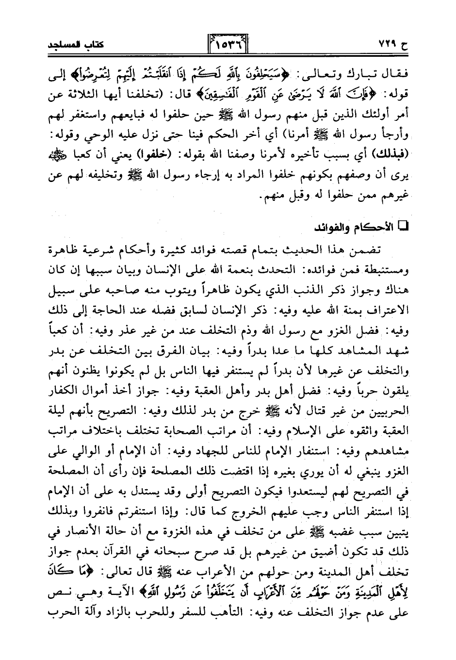 تضمن هذا الحديث بتمام قصته فوائد كثيرة وأحكام شرعية ظاهرة ومستنبطة فمن فوائده: التحدث بنعمة الله على الإنسان وبيان سببها إن كان هناك وجواز ذكر الذنب الذي يكون ظاهرًا ويتوب منه صاحبه على سبيل الاعتراف بمنة الله عليه وفيه: ذكر الإنسان لسابق فضله عند الحاجة إلى ذلك وفيه: فضل الغزو مع رسول الله وذم التخلف عند من غير عذر وفيه: أن كعبًا شهد المشاهد كلها ما عدا بدرًا وفيه: بيان الفرق بين التخلف عن بدر والتخلف عن غيرها لأن بدرًا لم يستنفر فيها الناس بل لم يكونوا يظنون أنهم يلقون حربًا وفيه: فضل أهل بدر وأهل العقبة وفيه: جواز أخذ أموال الكفار الحربيين من غير قتال لأنه - صلى الله عليه وسلم - خرج من بدر لذلك وفيه: التصريح بأنهم ليلة العقبة واثقوه على الإِسلام وفيه: أن مراتب الصحابة تختلف باختلاف مراتب مشاهدهم وفيه: استنفار الإِمام للناس للجهاد وفيه: أن الإِمام أو الوالي على الغزو ينبغي له أن يوري بغيره إذا اقتضت ذلك المصلحة فإن رأى أن المصلحة في التصريح لهم ليستعدوا فيكون التصريح أولى وقد يستدل به على أن الإِمام إذا استنفر الناس وجب عليهم الخروج كما قال: وإذا استنفرتم فانفروا وبذلك يتبين سبب غضبه - صلى الله عليه وسلم - على من تخلف في هذه الغزوة مع أن حالة الأنصار في ذلك قد تكون أضيق من غيرهم بل قد صرح سبحانه في القرآن بعدم جواز تخلف أهل المدينة ومن حولهم من الأعراب عنه - صلى الله عليه وسلم - قال تعالى: {مَا كَانَ لِأَهْلِ الْمَدِينَةِ وَمَنْ حَوْلَهُمْ مِنَ الْأَعْرَابِ أَنْ يَتَخَلَّفُوا عَنْ رَسُولِ اللَّهِ} الآية وهي نص على عدم جواز التخلف عنه وفيه: التأهب للسفر وللحرب بالزاد وآلة الحرب