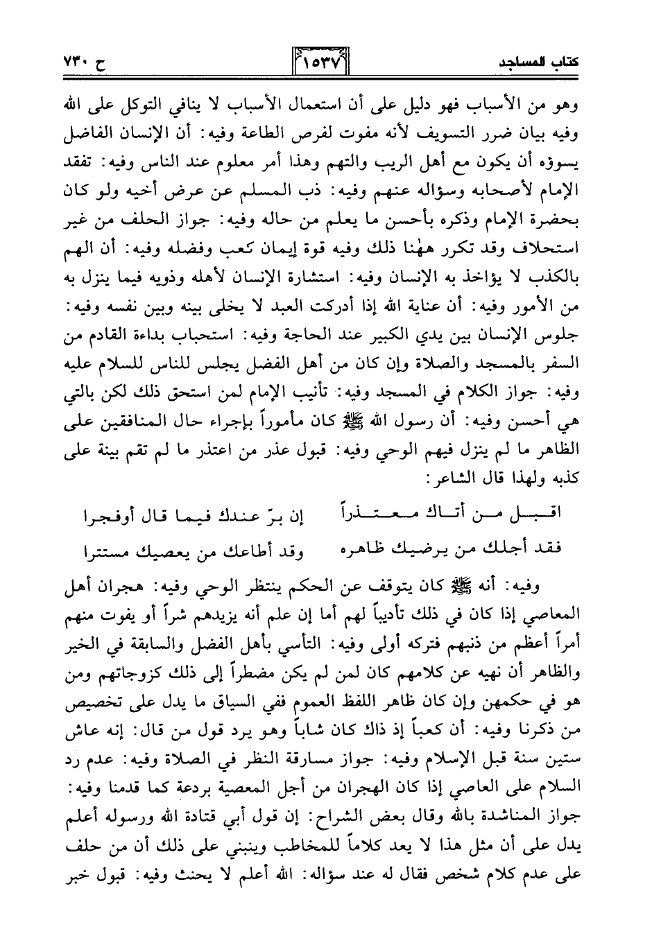 وهو من الأسباب فهو دليل على أن استعمال الأسباب لا ينافي التوكل على الله وفيه بيان ضرر التسويف لأنه مفوت لفرص الطاعة وفيه: أن الإنسان الفاضل يسوؤه أن يكون مع أهل الريب والتهم وهذا أمر معلوم عند الناس وفيه: تفقد الإِمام لأصحابه وسؤاله عنهم وفيه: ذب المسلم عن عرض أخيه ولو كان بحضرة الإِمام وذكره بأحسن ما يعلم من حاله وفيه: جواز الحلف من غير استحلاف وقد تكرر ههنا ذلك وفيه قوة إيمان كعب وفضله وفيه: أن الهم بالكذب لا يؤاخذ به الإنسان وفيه: استشارة الإنسان لأهله وذويه فيما ينزل به من الأمور وفيه: أن عناية الله إذا أدركت العبد لا يخلى بينه وبين نفسه وفيه: جلوس الإنسان بين يدي الكبير عند الحاجة وفيه: استحباب بداءة القادم من السفر بالمسجد والصلاة وإن كان من أهل الفضل يجلس للناس للسلام عليه وفيه: جواز الكلام في المسجد وفيه: تأنيب الإِمام لمن استحق ذلك لكن بالتي هي أحسن وفيه: أن رسول الله - صلى الله عليه وسلم - كان مأمورًا بإجراء حال المنافقين على الظاهر ما لم ينزل فيهم الوحي وفيه: قبول عذر من اعتذر ما لم تقم بينة على كذبه ولهذا قال الشاعر: