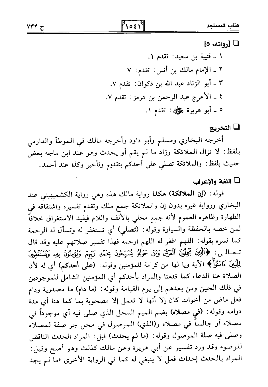 قوله: (إن الملائكة) هكذا رواية مالك هذه وهي رواية الكشميهيني عند البخاري ورواية غيره بدون إن والملائكة جمع ملك وتقدم تفسيره واشتقاقه في الطهارة وظاهره العموم لأنه جمع محلي بالألف واللام فيفيد الاستغراق خلافًا لمن خصه بالحفظة والسيارة وقوله: (تصلي) أي تستغفر له وتسأل له الرحمة كما فسره بقوله: اللهم اغفر له اللهم ارحمه فهذا تفسير صلاتهم عليه وقد قال تعالى: {الَّذِينَ يَحْمِلُونَ الْعَرْشَ وَمَنْ حَوْلَهُ يُسَبِّحُونَ بِحَمْدِ رَبِّهِمْ وَيُؤْمِنُونَ بِهِ وَيَسْتَغْفِرُونَ لِلَّذِينَ آمَنُوا} الآية ويا لها من كرامة للمؤمنين وقوله: (على أحدكم) أي له لأن الصلاة هنا الدعاء كما قدمنا والمراد بأحدكم أي المؤمنين الشامل للموجودين في ذلك الحين ومن بعدهم إلى يوم القيامة وقوله: (مادام) ما مصدرية ودام فعل ماض من أخوات كان إلا أنها لا تعمل إلا مصحوبة بما كما هنا أي مدة دوامه وقوله: (في مصلاه) بضم الميم المحل الذي صلى فيه أي موجودًا في مصلاه أو جالسًا في مصلاه و (الذي) الموصول في محل جر صفة لمصلاه وصلى فيه صلة الموصول وقوله: (ما لم يحدث) قيل: المراد الحدث الناقض للوضوء وقد ورد تفسير عن أبي هريرة وعن مالك كذلك وهو أصح وقيل: المراد بالحدث إحداث فعل لا ينبغي له كما في الرواية الأخرى "ما لم يجد