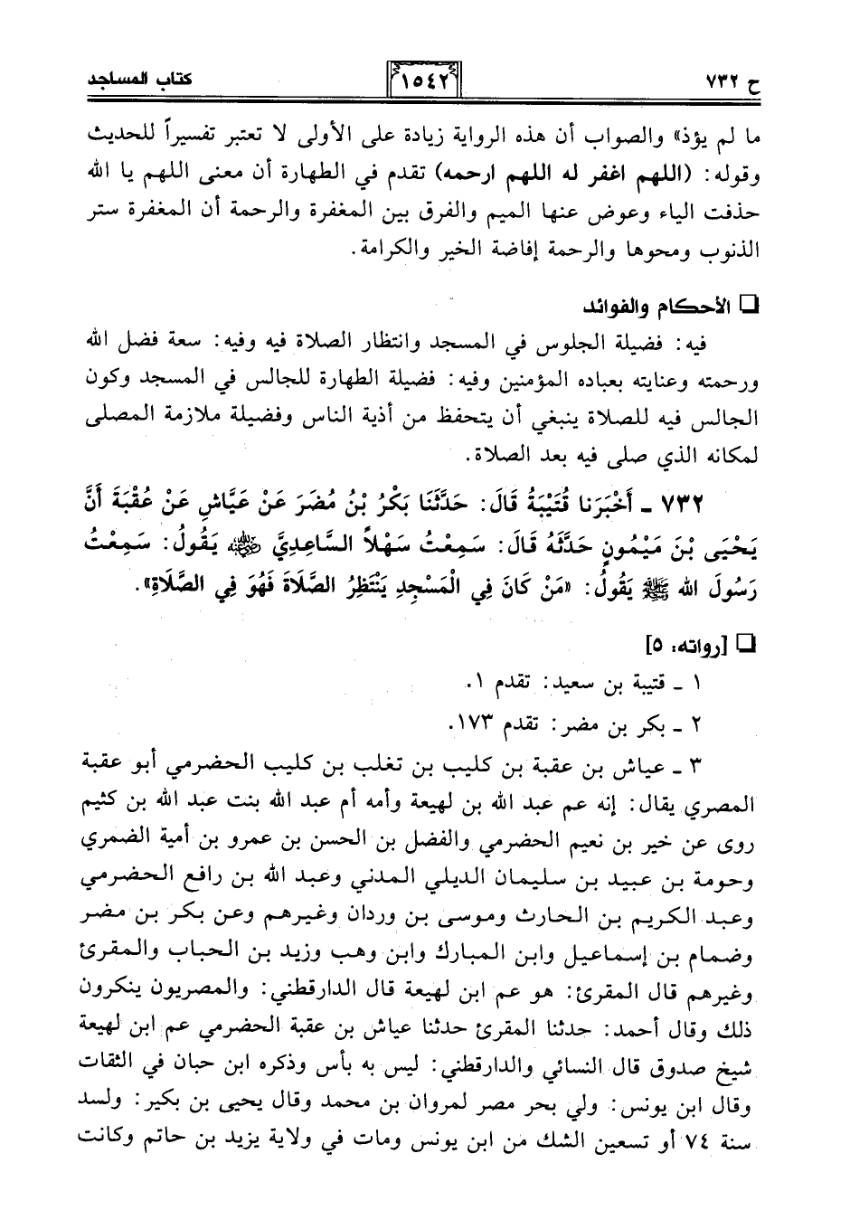 732 - أَخْبَرَنَا قُتَيْبَةُ قَالَ: حَدَّثَنَا بَكْرُ بْنُ مُضَرَ عَنْ عَيَّاشِ عن عُقْبَةَ أَنَّ يَحْيَى بْنَ مَيْمُونٍ حَدَّثَهُ قَالَ: سَمِعْتُ سَهْلًا السَّاعِدِيَّ - رضى الله عنه - يَقُولُ: سَمِعْتُ رَسُولَ اللَّهِ - صلى الله عليه وسلم - يَقُولُ: "مَنْ كَانَ فِي الْمَسْجِدِ يَنْتَظِرُ الصَّلَاةَ فَهُوَ في الصَّلَاةِ".