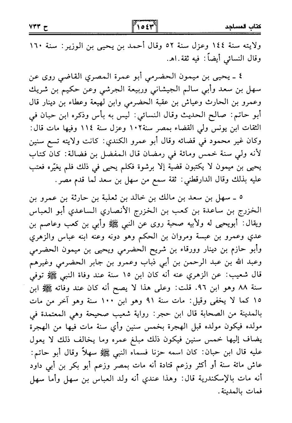 4 - يحيى بن ميمون الحضرمي أبو عمرة المصري القاضي روى عن سهل بن سعد وأبي سالم الجيشاني وربيعة الجرشي وعن حكيم بن شريك وعمرو بن الحارث وعياش بن عقبة الحضرمي وابن لهيعة وعطاء بن دينار قال أبو حاتم: صالح الحديث وقال النسائي: ليس به بأس وذكره ابن حبان في الثقات ابن يونس ولي القضاء بمصر سنة 102 وعزل سنة 114 وفيها مات قال: وكان غير محمود في قضائه وقال أبو عمرو الكندي: كانت ولايته تسع سنين لأنه ولي سنة خمس ومائة في رمضان قال المفضل بن فضالة: كان كتاب يحيى بن ميمون لا يكتبون قضية إلا برشوة فكلم يحيى في ذلك فلم يغيّره فعتب عليه بذلك وقال الدارقطني: ثقة سمع من سهل بن سعد لما قدم مصر.