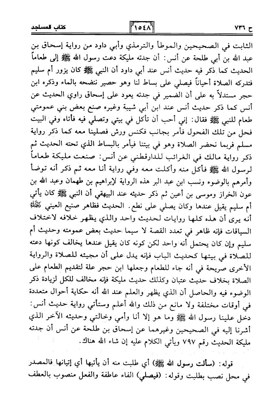 الثابت في الصحيحين والموطأ والترمذي وأبي داود من رواية إسحاق بن عبد الله بن أبي طلحة عن أنس: أن جدته مليكة دعت رسول الله - صلى الله عليه وسلم - إلى طعامًا الحديث كما ذكر فيه حديث أنس عند أبي داود أن النبي - صلى الله عليه وسلم - كان يزور أم سليم فتدركه الصلاة أحيانًا فيصلي على بساط لنا وهو حصير ننضحه بالماء وذكره ابن حجر مستدلًا به على أن الضمير في جدته يعود على إسحاق راوي الحديث عن أنس كما ذكر حديث أنس عند ابن أبي شيبة وغيره صنع بعض بني عمومتي طعام للنبي - صلى الله عليه وسلم - فقال: إني أحب أن تأكل في بيتي وتصلي فيه فأتاه وفي البيت فحل من تلك الفحول فأمر بجانب فكنس ورش فصلينا معه كما ذكر رواية مسلم فربما نحضر الصلاة وهو في بيتنا فيأمر بالبساط الذي تحته الحديث ثم ذكر رواية مالك في الغرائب للدارقطني عن أنس: صنعت مليكة طعامًا لرسول الله - صلى الله عليه وسلم - فأكل منه وأكلت معه وفي رواية أنا معه ثم ذكر أنه توضأ وأمرهم بالوضوء ونسب ابن عبد البر هذه الرواية لإبراهيم بن طهمان وعبد الله بن عون الخراز وموسى بن أعين ثم ذكر حديثه عند البيهقي أن النبي - صلى الله عليه وسلم - كان يأتي أم سليم يقيل عندها وكان يصلي على نطع. الحديث فظاهر صنيع العيني -رحمه الله- أنه يرى أن هذه كلها روايات لحديث واحد والذي يظهر خلافه لاختلاف السياقات فإنه ظاهر في تعدد القصة لاسيما حديث بعض عمومته وحديث أم سليم وإن كان يحتمل أنه واحد لكن كونه كان يقيل عندها يخالف كونها دعته للصلاة في بيتها كحديث الباب فإنه يدل على أن مجيئه للصلاة والرواية الأخرى صريحة في أنه جاء للطعام وجعلها ابن حجر علة لتقديم الطعام على الصلاة بخلاف حديث عتبان وكذلك حديث مليكة فإنه مخالف للكل لزيادة ذكر الوضوء فيه والحاصل أن الذي يظهر والعلم عند الله أنه حكاية أحوال متعددة في أوقات مختلفة ولا مانع من ذلك والله أعلم وستأتي رواية حديث أنس: دخل علينا رسول الله - صلى الله عليه وسلم - وما هو إلا أنا وأمي وخالتي وحديثه الآخر الذي أشرنا إليه في الصحيحين وغيرهما عن إسحاق بن طلحة عن أنس أن جدته مليكة الحديث رقم 797 ويأتي الكلام عليه إن شاء الله هناك.
