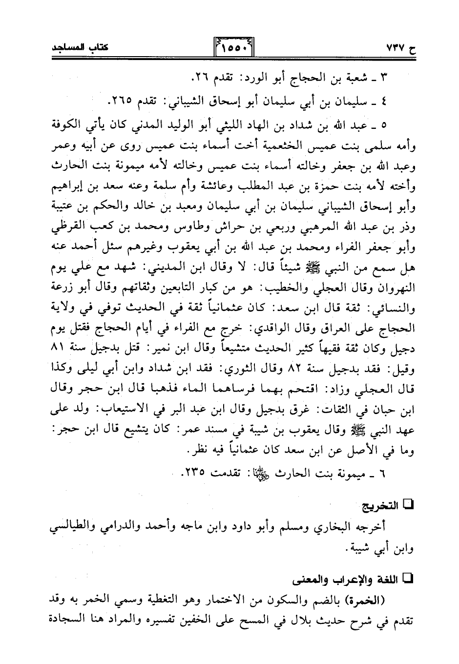 5 - عبد الله بن شداد بن الهاد الليثي أبو الوليد المدني كان يأتي الكوفة وأمه سلمى بنت عميس الخثعمية أخت أسماء بنت عميس روى عن أبيه وعمر وعبد الله بن جعفر وخالته أسماء بنت عميس وخالته لأمه ميمونة بنت الحارث وأخته لأمه بنت حمزة بن عبد المطلب وعائشة وأم سلمة وعنه سعد بن إبراهيم وأبو إسحاق الشيباني سليمان بن أبي سليمان ومعبد بن خالد والحكم بن عتيبة وذر بن عبد الله المرهبي وربعي بن حراش وطاوس ومحمد بن كعب القرظي وأبو جعفر الفراء ومحمد بن عبد الله بن أبي يعقوب وغيرهم سئل أحمد عنه هل سمع من النبي - صلى الله عليه وسلم - شيئًا قال: لا وقال ابن المديني: شهد مع علي يوم النهروان وقال العجلي والخطيب: هو من كبار التابعين وثقاتهم وقال أبو زرعة والنسائي: ثقة قال ابن سعد: كان عثمانيًا ثقة في الحديث توفي في ولاية الحجاج على العراق وقال الواقدي: خرج مع الفراء في أيام الحجاج فقتل يوم دجيل وكان ثقة فقيهًا كثير الحديث متشيعًا وقال ابن نمير: قتل بدجيل سنة 81 وقيل: فقد بدجيل سنة 82 وقال الثوري: فقد ابن شداد وابن أبي ليلى وكذا قال العجلي وزاد: اقتحم بهما فرساهما الماء فذهبا قال ابن حجر وقال ابن حبان في الثقات: غرق بدجيل وقال ابن عبد البر في الاستيعاب: ولد على عهد النبي - صلى الله عليه وسلم - وقال يعقوب بن شيبة في مسند عمر: كان يتشيع قال ابن حجر: وما في الأصل عن ابن سعد كان عثمانيًا فيه نظر.