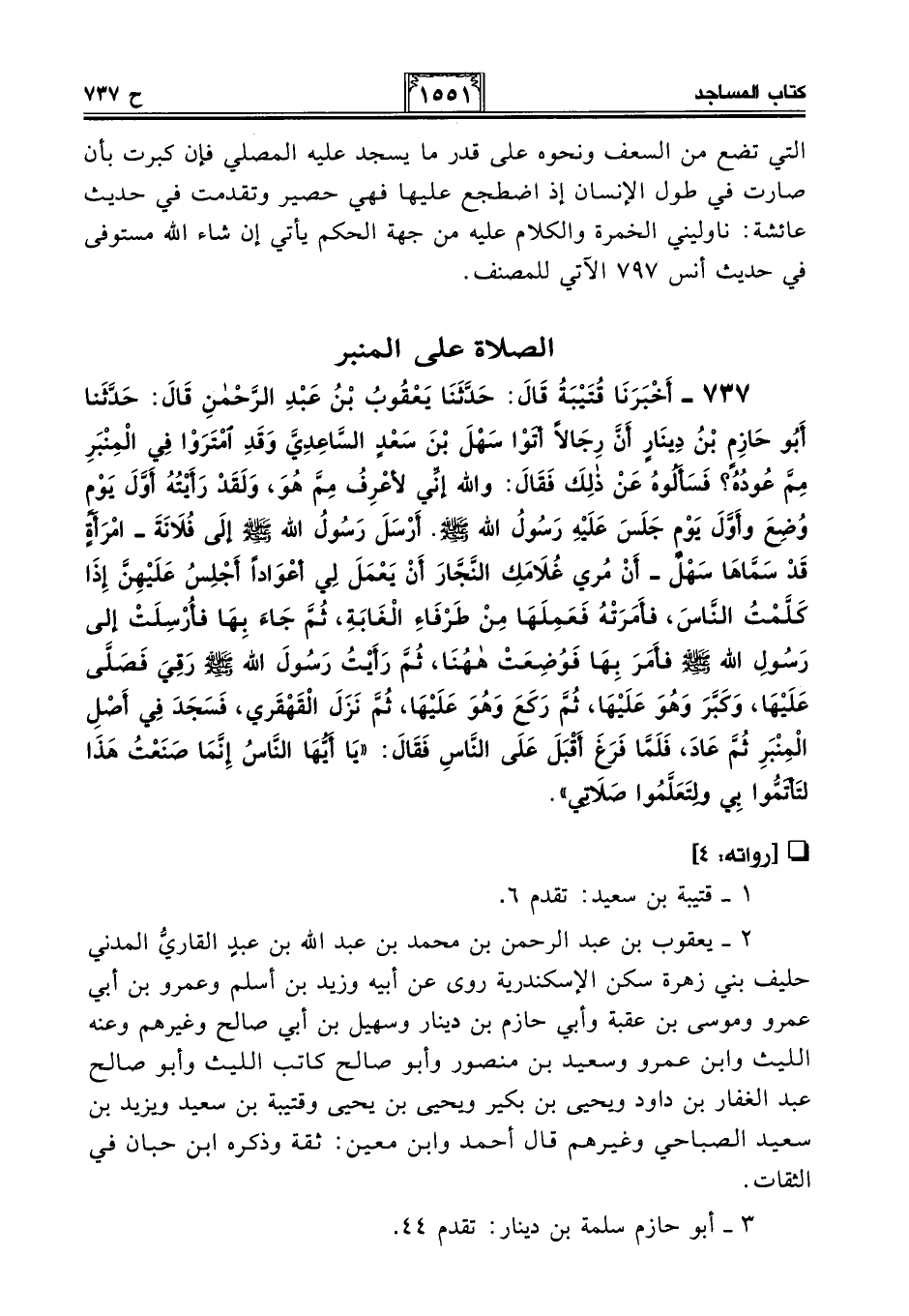 737 - أَخْبَرَنَا قُتَيْبَةُ قَالَ: حَدَّثَنَا يَعْقُوبُ بْنُ عَبْدِ الرَّحْمَنِ قَالَ: حَدَّثَنِي أَبُو حَازِمِ بْنِ دِينَارٍ أَنَّ رِجَالًا أَتَوْا سَهْلَ بْنَ سَعْدٍ السَّاعِدِيَّ وَقَدِ امْتَرَوْا فِي الْمِنْبَرِ مِمَّ عُودُهُ؟ فَسَأَلُوهُ عَنْ ذَلِكَ فَقَالَ: وَاللَّهِ إِنِّي لأَعْرِفُ مِمَّ هُوَ، وَلَقَدْ رَأَيْتُهُ أَوَّلَ يَوْمٍ وُضِعَ وَأَوَّلَ يَوْمٍ جَلَسَ عَلَيْهِ رَسُولُ اللَّهِ - صلى الله عليه وسلم -. أَرْسَلَ رَسُولُ اللَّهِ - صلى الله عليه وسلم - إِلَى فُلَانَةَ -امْرَأَةٍ قَدْ سَمَّاهَا سَهْلٌ- أَنْ مُرِي غُلَامَكِ النَّجَّارَ أَنْ يَعْمَلَ لِي أَعْوَادًا أَجْلِسُ عَلَيْهِنَّ إِذَا كَلَّمْتُ النَّاسَ، فَأَمَرَتْهُ فَعَمِلَهَا مِنْ طَرْفَاءِ الْغَابَةِ، ثُمَّ جَاءَ بِهَا فَأُرْسَلَتْ إِلَى رَسُولِ اللَّهِ - صلى الله عليه وسلم - فَأَمَرَ بِهَا فَوُضِعَتْ هَاهُنَا، ثُمَّ رَأَيْتُ رَسُولَ اللَّهِ - صلى الله عليه وسلم - رَقِيَ فَصَلَّى عَلَيْهَا، وَكَبَّرَ وَهُوَ عَلَيْهَا، ثُمَّ رَكَعَ وَهُوَ عَلَيْهَا، ثُمَّ نَزَلَ الْقَهْقَرَي، فَسَجَدَ فِي أَصْلِ الْمِنْبَرِ ثُمَّ عَادَ، فَلَمَّا فَرَغَ أَقْبَلَ عَلَى النَّاسِ فَقَالَ: "يَا أَيُّهَا النَّاسُ إِنَّمَا صَنَعْتُ هَذَا لِتَأْتَمُّوا بِي وَلِتَعَلَّمُوا صَلَاتِي".