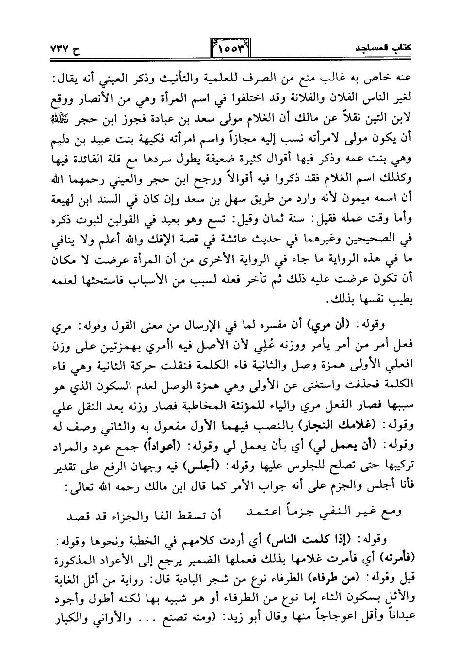 عنه خاص به غالب منع من الصرف للعلمية والتأنيث وذكر العيني أنه يقال: لغير الناس الفلان والفلانة وقد اختلفوا في اسم المرأة وهي من الأنصار ووقع لابن التين نقلًا عن مالك أن الغلام مولى سعد بن عبادة فجوز ابن حجر -رحمه الله- أن يكون مولى لامرأته نسب إليه مجازًا واسم امرأته فكيهة بنت عبيد بن دليم وهي بنت عمه وذكر فيها أقوال كثيرة ضعيفة يطول سردها مع قلة الفائدة فيها وكذلك اسم الغلام فقد ذكروا فيه أقوالًا ورجح ابن حجر والعيني -رحمهما الله- أن اسمه ميمون لأنه وارد من طريق سهل بن سعد وإن كان في السند ابن لهيعة وأما وقت عمله فقيل: سنة ثمان وقيل: تسع وهو بعيد في القولين لثبوت ذكره في الصحيحين وغيرهما في حديث عائشة في قصة الإفك والله أعلم ولا ينافي ما في هذه الرواية ما جاء في الرواية الأخرى من أن المرأة عرضت لا مكان أن تكون عرضت عليه ذلك ثم تأخر فعله لسبب من الأسباب فاستحثها لعلمه بطيب نفسها بذلك.