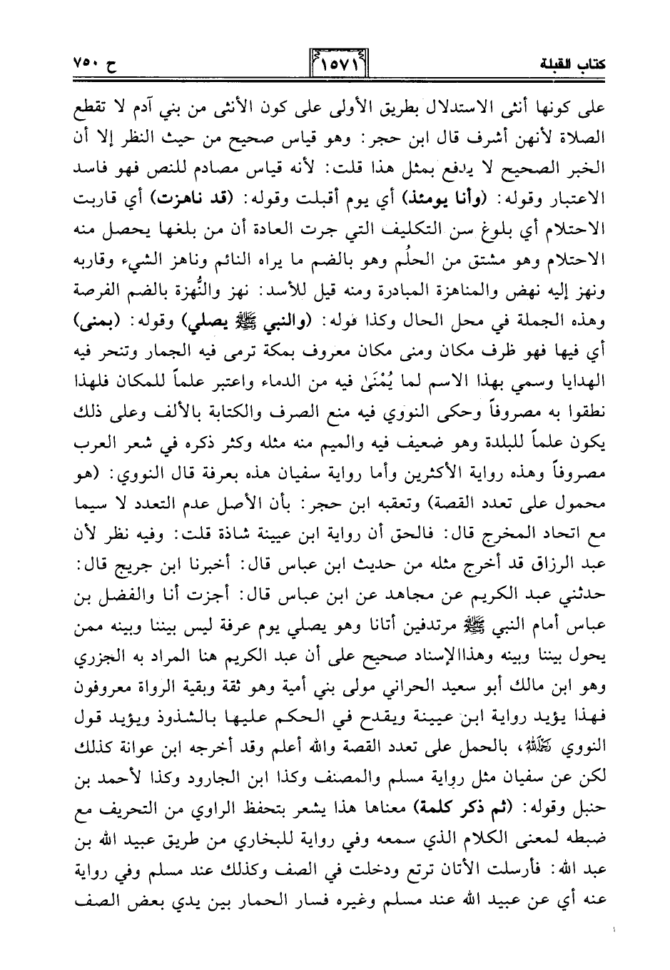 على كونها أنثى الاستدلال بطريق الأولى على كون الأنثى من بني آدم لا تقطع الصلاة لأنهن أشرف قال ابن حجر: وهو قياس صحيح من حيث النظر إلا أن الخبر الصحيح لا يدفع بمثل هذا قلت: لأنه قياس مصادم للنص فهو فاسد الاعتبار وقوله: (وأنا يومئذ) أي يوم أقبلت وقوله: (قد ناهزت) أي قاربت الاحتلام أي بلوغ سن التكليف التي جرت العادة أن من بلغها يحصل منه الاحتلام وهو مشتق من الحلُم وهو بالضم ما يراه النائم وناهز الشيء وقاربه ونهز إليه نهض والمناهزة المبادرة ومنه قيل للأسد: نهز والنُّهزة بالضم الفرصة وهذه الجملة في محل الحال وكذا قوله: (والنبي - صلى الله عليه وسلم - يصلي) وقوله: (بمنى) أي فيها فهو ظرف مكان ومنى مكان معروف بمكة ترمى فيه الجمار وتنحر فيه الهدايا وسمي بهذا الاسم لما يُمْنَى فيه من الدماء واعتبر علمًا للمكان فلهذا نطقوا به مصروفًا وحكى النووي فيه منع الصرف والكتابة بالألف وعلى ذلك يكون علمًا للبلدة وهو ضعيف فيه والميم منه مثله وكثر ذكره في شعر العرب مصروفًا وهذه رواية الأكثرين وأما رواية سفيان هذه بعرفة قال النووي: (هو محمول على تعدد القصة) وتعقبه ابن حجر: بأن الأصل عدم التعدد لاسيما مع اتحاد المخرج قال: فالحق أن رواية ابن عيينة شاذة قلت: وفيه نظر لأن عبد الرزاق قد أخرج مثله من حديث ابن عباس قال: أخبرنا ابن جريج قال: حدثني عبد الكريم عن مجاهد عن ابن عباس قال: أجزت أنا والفضل بن عباس أمام النبي - صلى الله عليه وسلم - مرتدفين أتانا وهو يصلي يوم عرفة ليس بيننا وبينه ممن يحول بيننا وبينه وهذا الإسناد صحيح على أن عبد الكريم هنا المراد به الجزري وهو ابن مالك أبو سعيد الحراني مولى بني أمية وهو ثقة وبقية الرواة معروفون فهذا يؤيد رواية ابن عيينة ويقدح في الحكم عليها بالشذوذ ويؤيد قول النووي -رحمه الله-، بالحمل على تعدد القصة والله أعلم وقد أخرجه ابن عوانة كذلك لكن عن سفيان مثل رواية مسلم والمصنف وكذا ابن الجارود وكذا لأحمد بن حنبل وقوله: (ثم ذكر كلمة) معناها هذا يشعر بتحفظ الراوي من التحريف مع ضبطه لمعنى الكلام الذي سمعه وفي رواية للبخاري من طريق عبيد الله بن عبد الله: فأرسلت الأتان ترتع ودخلت في الصف وكذلك عند مسلم وفي رواية عنه أي عن عبيد الله عند مسلم وغيره فسار الحمار بين يدي بعض الصف