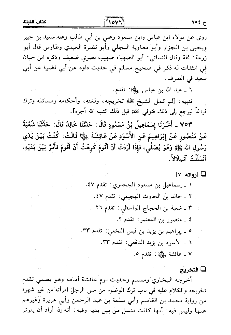 753 - أَخْبَرَنَا إِسْمَاعِيلُ بْنُ مَسْعُودٍ قَالَ: حَدَّثَنَا خَالِدٌ قَالَ: حَدَّثَنَا شُعْبَةُ عَنْ مَنْصُورٍ عَنْ إِبْرَاهِيمَ عَنِ الأَسْوَدِ عَنْ عَائِشَةَ -رضي الله عنها- قَالَتْ: كُنْتُ بَيْنَ يَدَيْ رَسُولِ اللَّهِ - صلى الله عليه وسلم - وَهُوَ يُصَلِّي، فَإِذَا أَرَدْتُ أَنْ أَقُومَ كَرِهْتُ أَنْ أَقُومَ فَأَمُرَّ بَيْنَ يَدَيْهِ، انْسَلَلْتُ انْسِلَالًا.