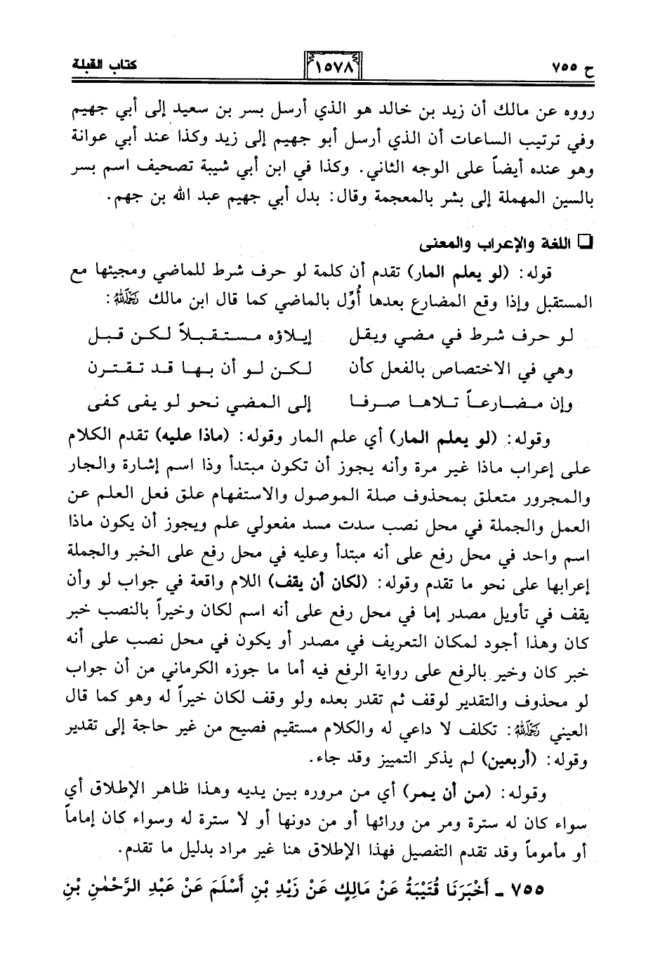 قوله: (لو يعلم المار) تقدم أن كلمة لو حرف شرط للماضي ومجيئها مع المستقبل وإذا وقع المضارع بعدها أُوِّل بالماضي كما قال ابن مالك -رحمه الله-: