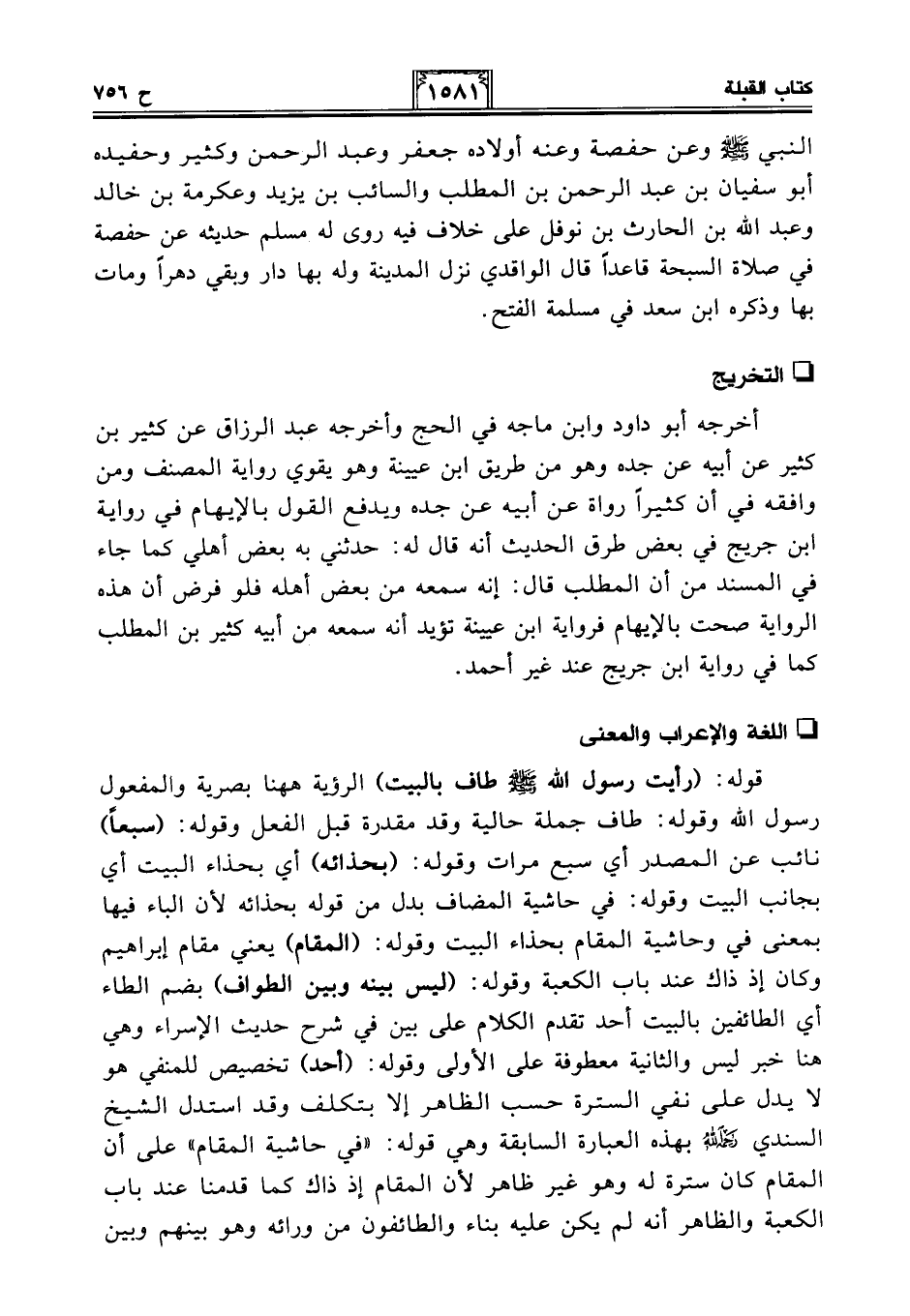 قوله: (رأيت رسول الله - صلى الله عليه وسلم - طاف بالبيت) الرؤية هاهنا بصرية والمفعول رسول الله وقوله: طاف جملة حالية وقد مقدرة قبل الفعل وقوله: (سبعًا) نائب عن المصدر أي سبع مرات وقوله: (بحذائه) أي بحذاء البيت أي بجانب البيت وقوله: في حاشية المضاف بدل من قوله بحذائه لأن الباء فيها بمعنى في وحاشية المقام بحذاء البيت وقوله: (المقام) يعني مقام إبراهيم وكان إذ ذاك عند باب الكعبة وقوله: (ليس بينه وبين الطواف) بضم الطاء أي الطائفين بالبيت أحد تقدم الكلام على بين في شرح حديث الإسراء وهي هنا خبر ليس والثانية معطوفة على الأولى وقوله: (أحد) تخصيص للمنفي هو لا يدل على نفي السترة حسب الظاهر إلا بتكلف وقد استدل الشيخ السندي -رحمه الله- بهذه العبارة السابقة وهي قوله: "في حاشية المقام" على أن المقام كان سترة له وهو غير ظاهر لأن المقام إذ ذاك كما قدمنا عند باب الكعبة والظاهر أنه لم يكن عليه بناء والطائفون من ورائه وهو بينهم وبين