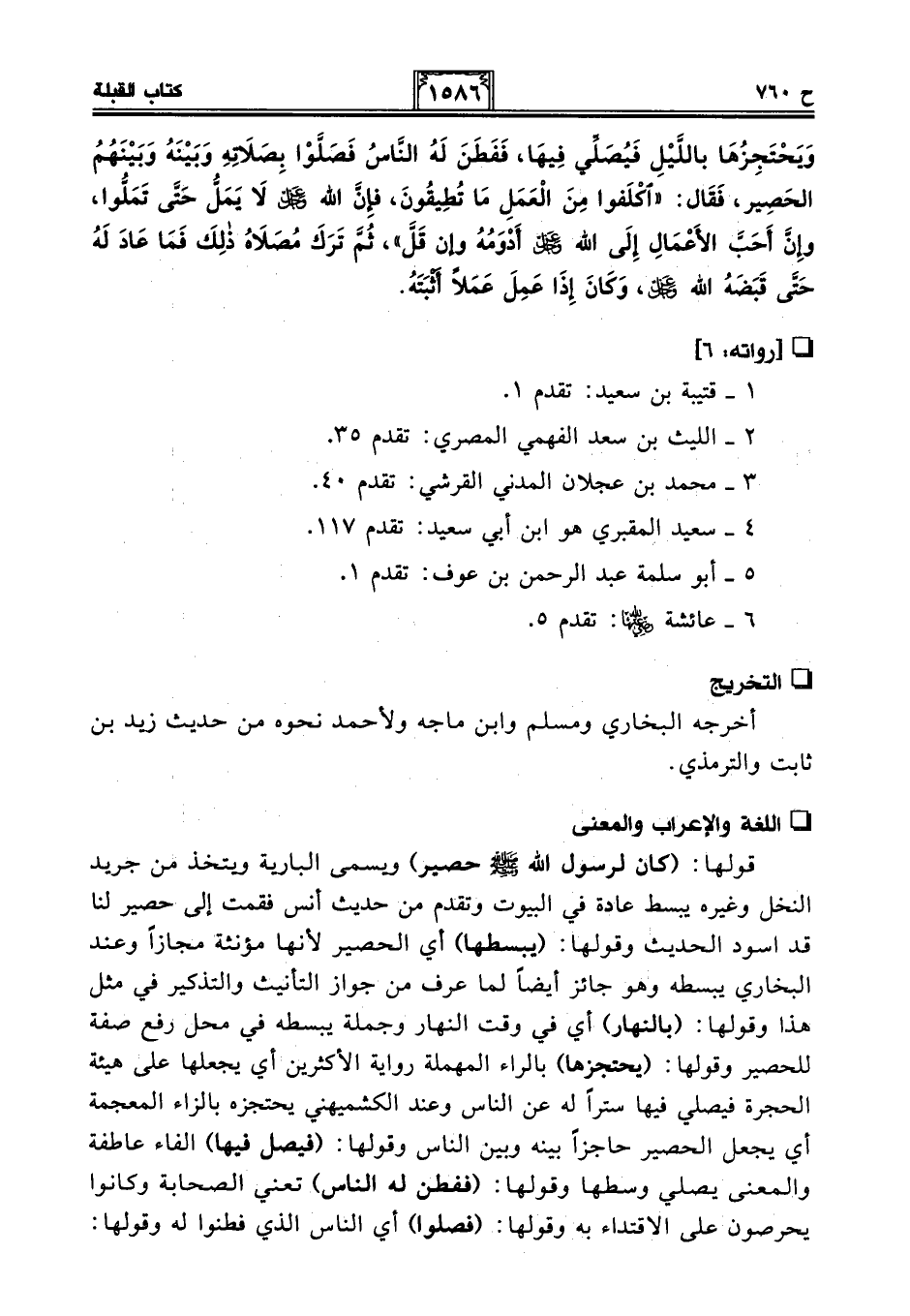 قولها: (كان لرسول الله - صلى الله عليه وسلم - حصير) ويسمى البارية ويتخذ من جريد النخل وغيره يبسط عادة في البيوت وتقدم من حديث أنس فقمت إلى حصير لنا قد اسود الحديث وقولها: (يبسطها) أي الحصير لأنها مؤنثة مجازًا وعند البخاري يبسطه وهو جائز أيضًا لما عوف من جواز التأنيث والتذكير في مثل هذا وقولها: (بالنهار) أي في وقت النهار وجملة يبسطه في محل رفع صفة للحصير وقولها: (يحتجزها) بالراء المهملة رواية الأكثرين أي يجعلها على هيئة الحجرة فيصلي فيها سترًا له عن الناس وعند الكشميهني يحتجزه بالزاء المعجمة أي يجعل الحصير حاجزًا بينه وبين الناس وقولها: (فيصل فيها) الفاء عاطفة والمعنى يصلي وسطها وقولها: (ففطن له الناس) تعني الصحابة وكانوا يحرصون على الاقتداء به وقولها: (فصلوا) أي الناس الذي فطنوا له وقولها: