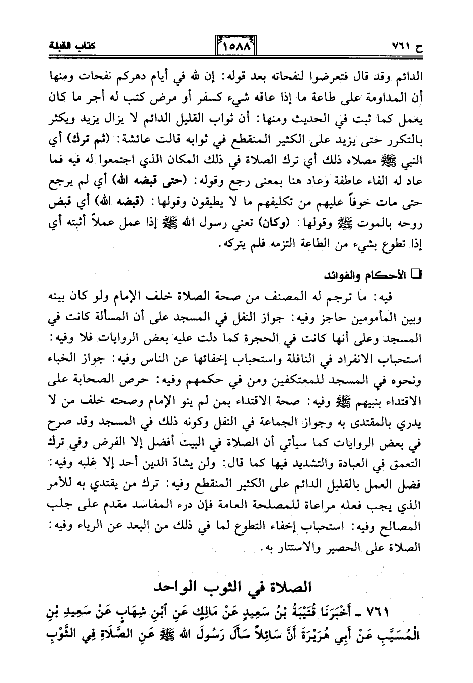 761 - أَخْبَرَنَا قُتَيْبَةُ بْنُ سَعِيدٍ عَنْ مَالِكٍ عَنِ ابْنِ شِهَابٍ عَنْ سَعِيدِ بْنِ الْمُسَيَّبِ عَنْ أَبِي هُرَيْرَةَ أَنَّ سَائِلًا سَأَلَ رَسُولَ اللَّهِ - صلى الله عليه وسلم - عَنِ الصَّلَاةِ فِي الثَّوْبِ