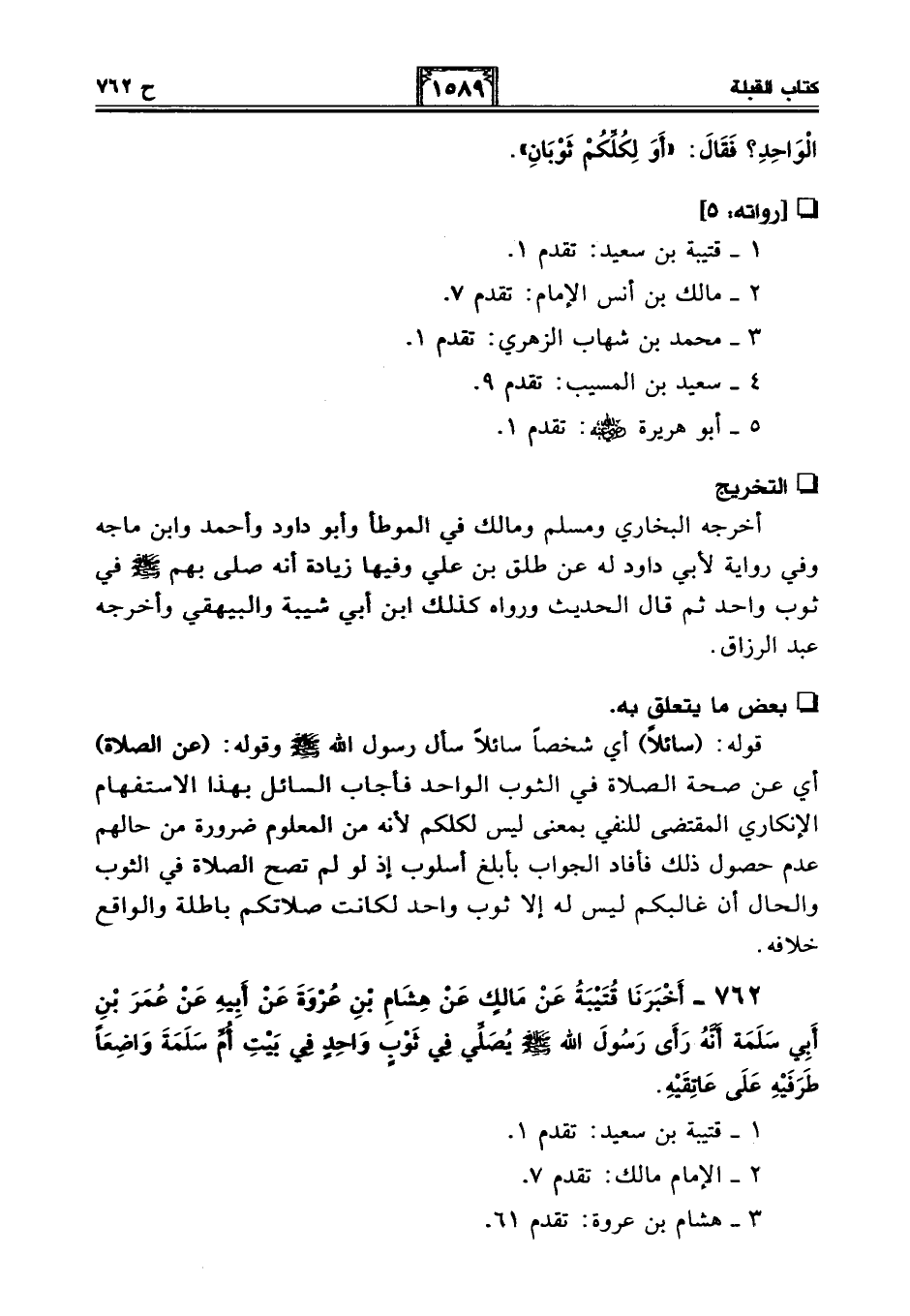 762 - أَخْبَرَنَا قُتَيْبَةُ عَنْ مَالِكٍ عَنْ هِشَامِ بْنِ عُرْوَةَ عَنْ أَبِيهِ عَنْ عُمَرَ بْنِ أَبِي سَلَمَةَ أَنَّهُ رَأَى رَسُولَ اللَّهِ - صلى الله عليه وسلم - يُصَلِّي فِي ثَوْبٍ وَاحِدٍ فِي بَيْتِ أُمِّ سَلَمَةَ وَاضِعًا طَرَفَيْهِ عَلَى عَاتِقَيْهِ.