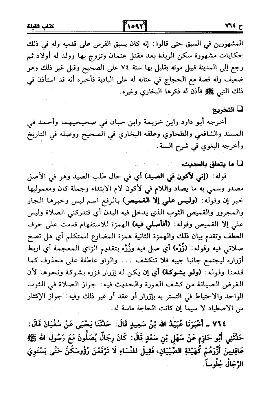 قوله: (إني لأكون في الصيد) أي في حال طلب الصيد وهو في الأصل مصدر وسمي به ما يصاد واللام في لأكون لام الابتداء وجملة كان ومعموليها خبر إن وقوله: (وليس علي إلا القميص) بالرفع اسم ليس وخبرها الجار والمجرور والقميص الثوب الذي يدخل فيه البدن أي فتدركني الصلاة وليس علي إلا القميص وقوله: (أفأصلي فيه) الهمزة للاستفهام قدمت على حرف العطف وتقدم بيان ذلك والهمزة الثانية همزة المضارع للمتكلم أي هل تصح صلاتي فيه وقوله: (زُرَّه) أي صل فيه وزُرَّه بتقديم الزاي المعجمة أي اربط أزراره ليجتمع جانبا جيبه فلا تنكشف. . . والواو عاطفة على محذوف كما قدمنا وقوله: (ولو بشوكة) أي إن يكن له إزرار فزره بشوكة ونحوها لأن الغرض الصيانة من كشف العورة والحديث فيه: جواز الصلاة في الثوب الواحد والاحتياط في التستر به بإزرار أو عقد أو غير ذلك وفيه: جواز الإكثار من الاصطياد لاسيما إن كانت الحاجة ماسة له.