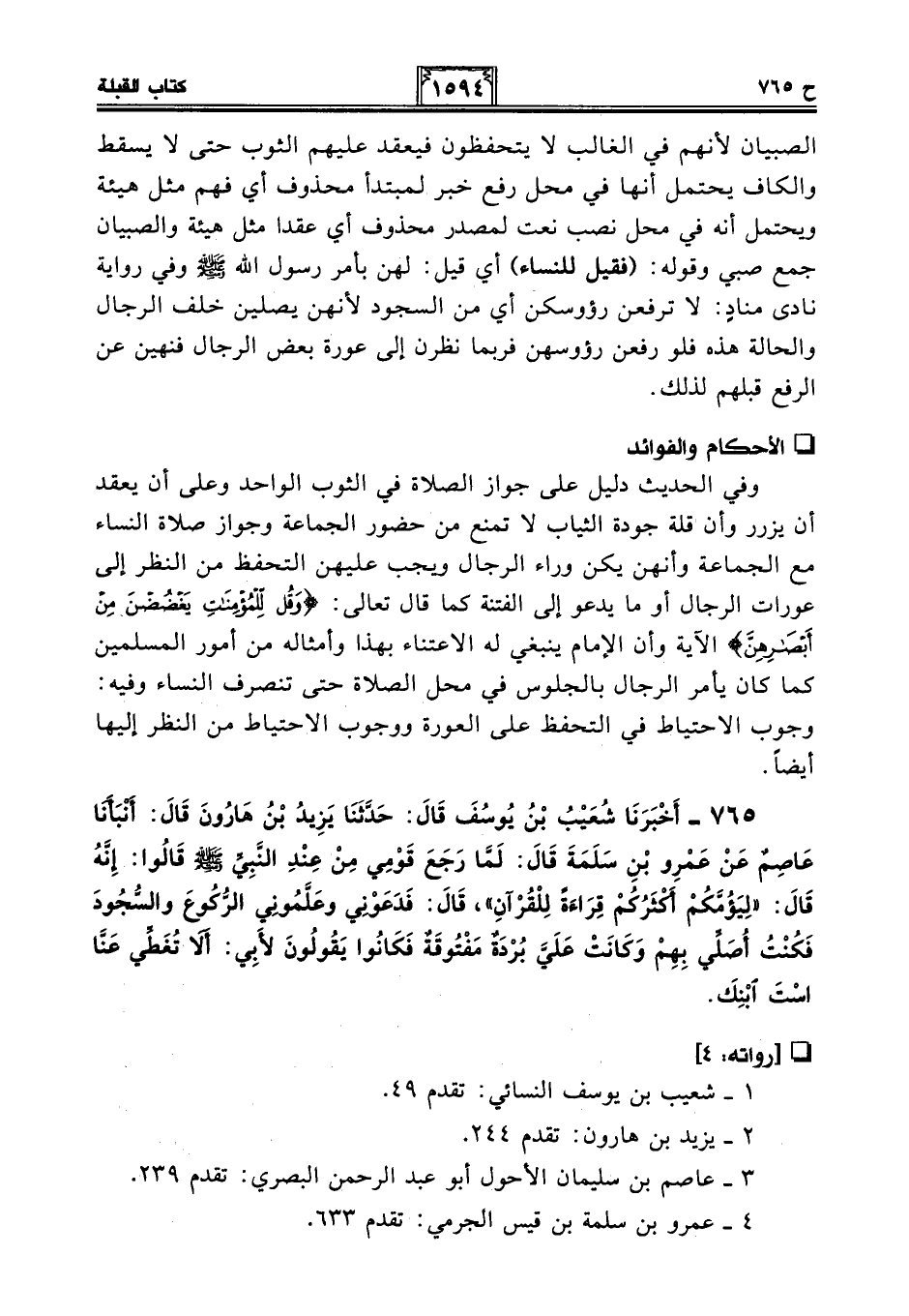 وفي الحديث دليل على جواز الصلاة في الثوب الواحد وعلى أن يعقد أن يزرر وأن قلة جودة الثياب لا تمنع من حضور الجماعة وجواز صلاة النساء مع الجماعة وأنهن يكن وراء الرجال ويجب عليهن التحفظ من النظر إلى عورات الرجال أو ما يدعو إلى الفتنة كما قال تعالى: {وَقُلْ لِلْمُؤْمِنَاتِ يَغْضُضْنَ مِنْ أَبْصَارِهِنَّ} الآية وأن الإِمام ينبغي له الاعتناء بهذا وأمثاله من أمور المسلمين كما كان يأمر الرجال بالجلوس في محل الصلاة حتى تنصرف النساء وفيه: وجوب الاحتياط في التحفظ على العورة ووجوب الاحتياط من النظر إليها أيضًا.