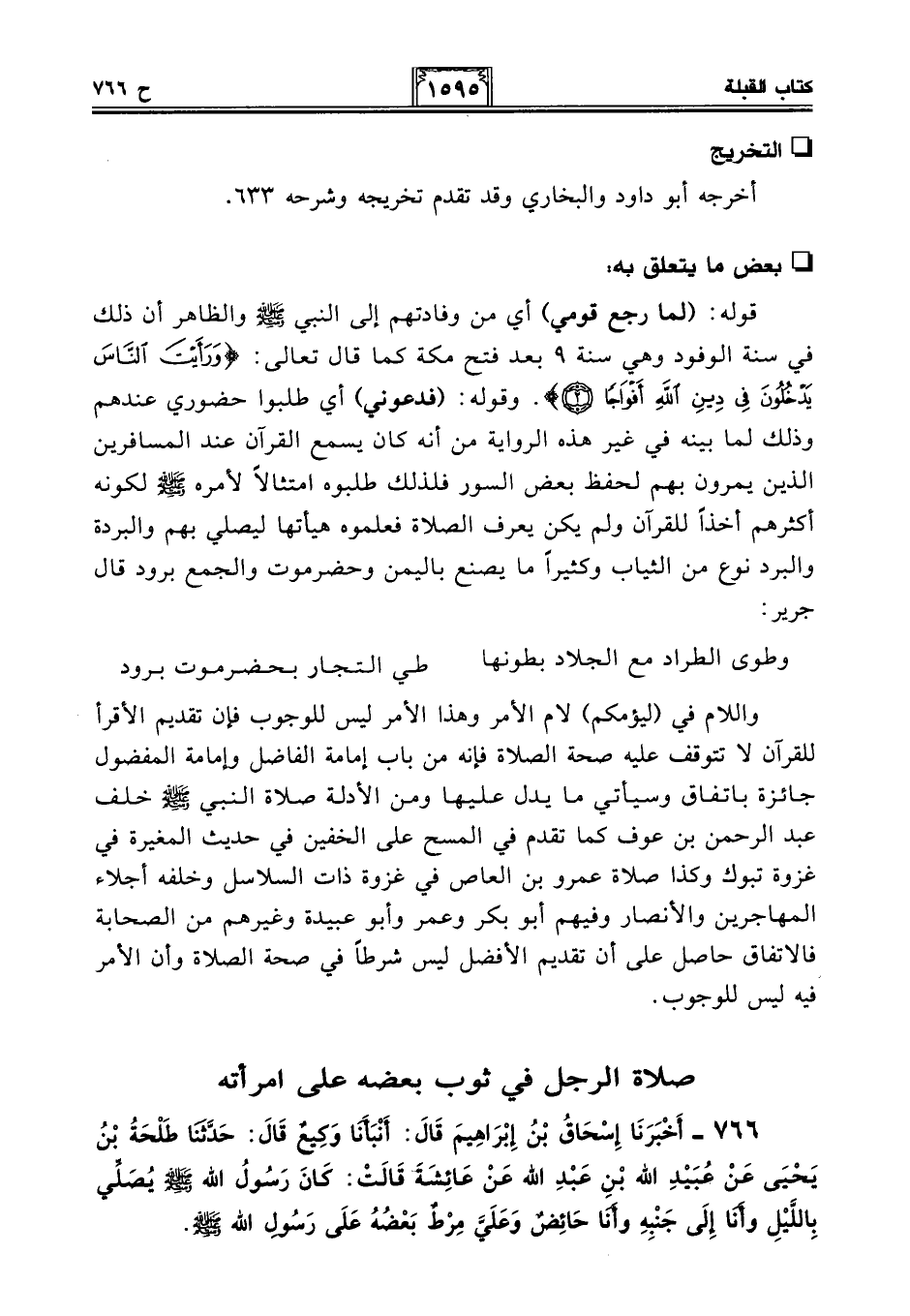 766 - أَخْبَرَنَا إِسْحَاقُ بْنُ إِبْرَاهِيمَ قَالَ: أَنْبَأَنَا وَكِيعٌ قَالَ: حَدَّثَنَا طَلْحَةُ بْنُ يَحْيَى عَنْ عُبَيْدِ اللَّهِ بْنِ عَبْدِ اللَّهِ عَنْ عَائِشَةَ قَالَتْ: كَانَ رَسُولُ اللَّهِ - صلى الله عليه وسلم - يُصَلِّي بِاللَّيْلِ وَأَنَا إِلَى جَنْبِهِ وَأَنَا حَائِضٌ وَعَلَيَّ مِرْطٌ بَعْضُهُ عَلَى رَسُولِ اللَّهِ - صلى الله عليه وسلم -.