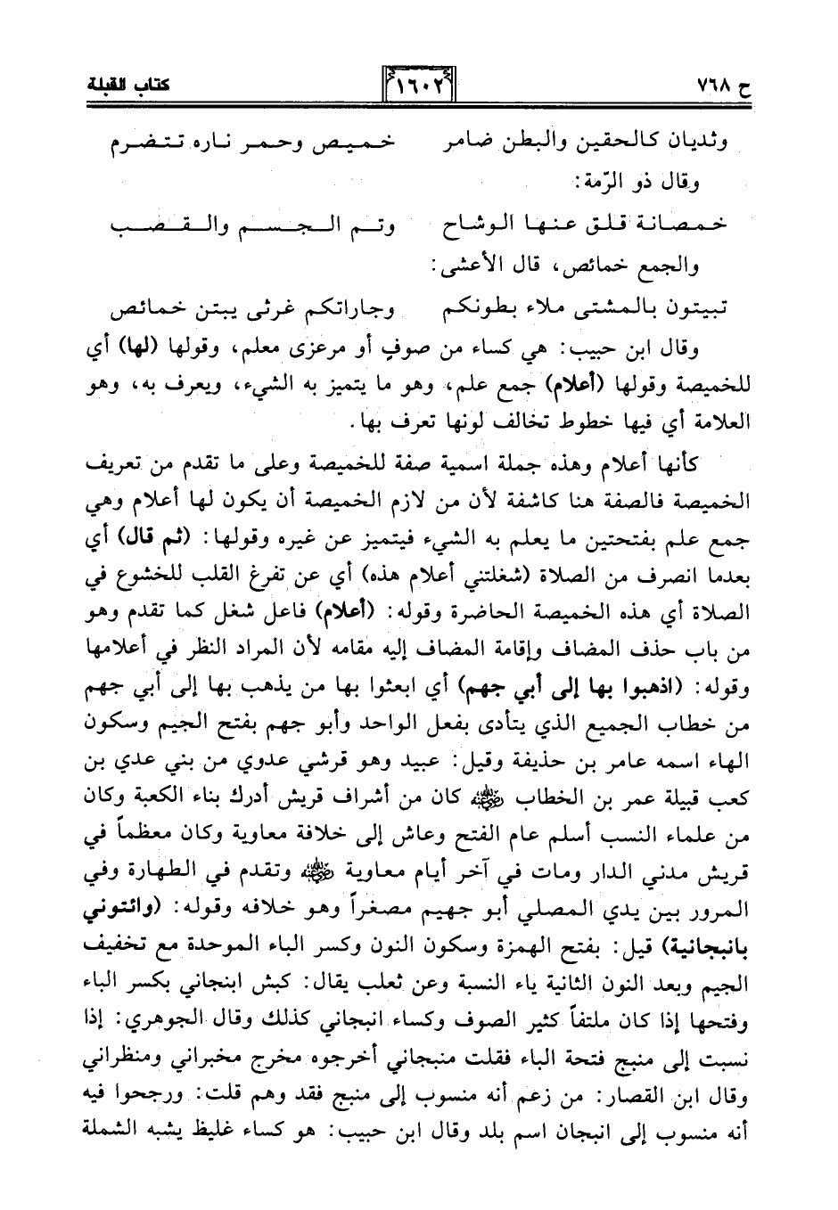 كأنها أعلام وهذه جملة اسمية صفة للخميصة وعلى ما تقدم من تعريف الخميصة فالصفة هنا كاشفة لأن من لازم الخميصة أن يكون لها أعلام وهي جمع علم بفتحتين ما يعلم به الشيء فيتميز عن غيره وقولها: (ثم قال) أي بعدما انصرف من الصلاة (شغلتني أعلام هذه) أي عن تفرغ القلب للخشوع في الصلاة أي هذه الخميصة الحاضرة وقوله: (أعلام) فاعل شغل كما تقدم وهو من باب حذف المضاف وإقامة المضاف إليه مقامه لأن المراد النظر في أعلامها وقوله: (اذهبوا بها إلى أبي جهم) أي ابعثوا بها من يذهب بها إلى أبي جهم من خطاب الجميع الذي يتأدى بفعل الواحد وأبو جهم بفتح الجيم وسكون الهاء اسمه عامر بن حذيفة وقيل: عبيد وهو قرشي عدوي من بني عدي بن كعب قبيلة عمر بن الخطاب - رضي الله عنه - كان من أشراف قريش أدرك بناء الكعبة وكان من علماء النسب أسلم عام الفتح وعاش إلى خلافة معاوية وكان معظمًا في قريش مدني الدار ومات في آخر أيام معاوية - رضي الله عنه - وتقدم في الطهارة وفي المرور بين يدي المصلي أبو جهيم مصغرًا وهو خلافه وقوله: (وائتوني بانبجانية) قيل: بفتح الهمزة وسكون النون وكسر الباء الموحدة مع تخفيف الجيم وبعد النون الثانية ياء النسبة وعن ثعلب يقال: كبش ابنجاني بكسر الباء وفتحها إذا كان ملتفًا كثير الصوف وكساء انبجاني كذلك وقال الجوهري: إذا نسبت إلى منبج فتحة الباء فقلت منبجاني أخرجوه مخرج مخبراني ومنظراني وقال ابن القصار: من زعم أنه منسوب إلى منبج فقد وهم قلت: ورجحوا فيه أنه منسوب إلى انبجان اسم بلد وقال ابن حبيب: هو كساء غليظ يشبه الشملة
