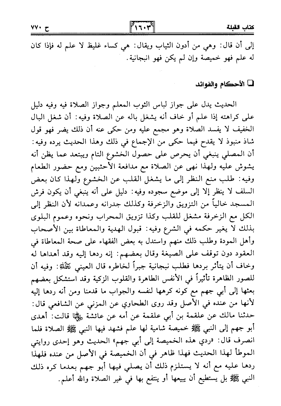 الحديث يدل على جواز لباس الثوب المعلم وجواز الصلاة فيه وفيه دليل على كراهته إذا علم أو خاف أنه يشغل باله عن الصلاة وفيه: أن شغل البال الخفيف لا يفسد الصلاة وهو مجمع عليه ومن حكى عنه أن ذلك يضر فهو قول شاذ منبوذ لا يقدح فيما حكى من الإجماع في ذلك وهذا الحديث يرده وفيه: أن المصلي ينبغي أن يحرص على حصول الخشوع التام ويبتعد عما يظن أنه يشوش عليه ولهذا نهى عن الصلاة مع مدافعة الأخبثين ومع حضور الطعام وفيه: طلب منع النظر إلى ما يشغل القلب عن الخشوع ولهذا كان بعض السلف لا ينظر إلا إلى موضع سجوده وفيه: دليل على أنه ينبغي أن يكون فرش المسجد خاليًا من التزويق والزخرفة وكذلك جدرانه وعمدانه لأن النظر إلى الكل مع الزخرفة مشغل للقلب وكذا تزويق المحراب ونحوه وعموم البلوى بذلك لا يغير حكمه في الشرع وفيه: قبول الهدية والمعاطاة بين الأصحاب وأهل المودة وطلب ذلك منهم واستدل به بعض الفقهاء على صحة المعاطاة في العقود دون توقف على الصيغة وقال بعضهم: إنه ردها إليه وقد أهداها له وخاف أن يتأثر بردها فطلب نبجانية جبرًا لخاطره قال العيني -رحمه الله-: وفيه أن للصور الظاهرة تأثيرًا في الأنفس الطاهرة والقلوب الزكية وقد استشكل بعضهم بعثها إلى أبي جهم مع كونه كرهها لنفسه والجواب ما قدمنا ومن أنه ردها إليه لأنها من عنده في الأصل وقد روى الطحاوي عن المزني عن الشافعي قال: حدثنا مالك عن علقمة بن أبي علقمة عن أمه عن عائشة -رضي الله عنها- قالت: أهدى أبو جهم إلى النبي - صلى الله عليه وسلم - خميصة شامية لها علم فشهد فيها النبي - صلى الله عليه وسلم - الصلاة فلما انصرف قال: "ردي هذه الخميصة إلى أبي جهم" الحديث وهو إحدى روايتي الموطأ لهذا الحديث فهذا ظاهر في أن الخميصة في الأصل من عنده فلهذا ردها عليه مع أنه لا يستلزم ذلك أن يصلي فيها أبو جهم بعدما كره ذلك النبي - صلى الله عليه وسلم - بل يستطيع أن يبيعها أو ينتفع بها في غير الصلاة والله أعلم.