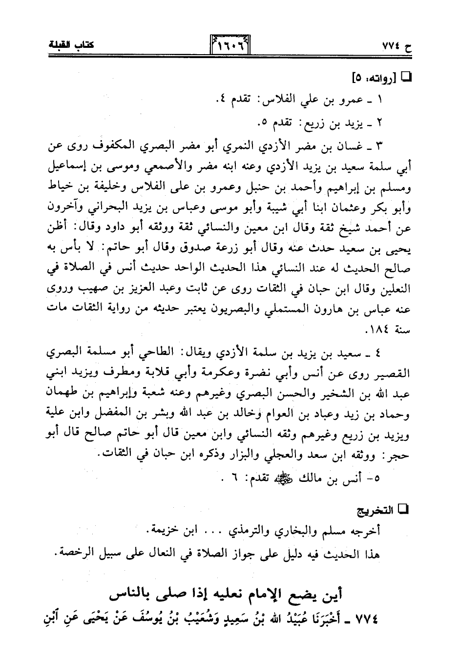 3 - غسان بن مضر الأزدي النمري أبو مضر البصري المكفوف روى عن أبي سلمة سعيد بن يزيد الأزدي وعنه ابنه مضر والأصمعي وموسى بن إسماعيل ومسلم بن إبراهيم وأحمد بن حنبل وعمرو بن علي الفلاس وخليفة بن خياط وأبو بكر وعثمان ابنا أبي شيبة وأبو موسى وعباس بن يزيد البحراني وآخرون عن أحمد شيخ ثقة وقال ابن معين والنسائي ثقة ووثقه أبو داود وقال: أظن يحيى بن سعيد حدث عنه وقال أبو زرعة صدوق وقال أبو حاتم: لا بأس به صالح الحديث له عند النسائي هذا الحديث الواحد حديث أنس في الصلاة في النعلين وقال ابن حبان في الثقات روى عن ثابت وعبد العزيز بن صهيب وروى عنه عباس بن هارون المستملي والبصريون يعتبر حديثه من رواية الثقات مات سنة 184.