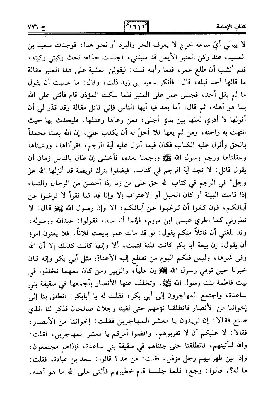 لا يبالي أيّ ساعة خرج لا يعرف الحر والبرد أو نحو هذا، فوجدت سعيد بن المسيب عند ركن المنبر الأيمن قد سبقني، فجلست حذاءه تحك ركبتي ركبته، فلم أنشب أن طلع عمر، فلما رأيته قلت: ليقولن العشية على هذا المنبر مقالة ما قالها أحد قبله، قال: فأنكر سعيد بن زيد ذلك، وقال: ما عسيت أن يقول ما لم يقل أحد، فجلس عمر على المنبر فلما سكت المؤذن قام فأثنى على الله بما هو أهله، ثم قال: أما بعد فيا أيها الناس فإني قائل مقالة وقد قدّر لي أن أقولها لا أدري لعلها بين يدي أجلي، فمن وعاها وعقلها، فليحدث بها حيث انتهت به راحته، ومن لم يعها فلا أحلّ له أن يكذب عليّ، إن الله بعث محمدًا بالحق وأنزل عليه الكتاب فكان فيما أنزل عليه آية الرجم، فقرأناها، ووعيناها وعقلناها ورجم رسول الله - صلى الله عليه وسلم - ورجمنا بعده، فأخشى إن طال بالناس زمان أن يقول قائل: لا نجد آية الرجم في كتاب، فيضلوا بترك فريضة قد أنزلها الله -عزّ وجلّ- في الرجم في كتاب الله حق على من زنا إذا أحصن من الرجال والنساء إذا قامت البينة أو كان الحبل أو الاعتراف إلا وإنا قد كنا نقرأ لا ترغبوا عن آبائكم، فإن كفرا أن ترغبوا عن آبائكم، إلا وإن رسول الله - صلى الله عليه وسلم - قال: لا تطروني كما اطري عيسى ابن مريم، فإنما أنا عبد، فقولوا: عبد الله ورسوله، وقد بلغني أن قائلًا منكم يقول: لو قد مات عمر بايعت فلانًا، فلا يغترن امرؤ أن يقول: إن بيعة أبا بكر كانت فلتة فتمت، ألا وإنها كانت كذلك إلا أن الله وقى شرها، وليس فيكم اليوم من تقطع إليه الأعناق مثل أبي بكر وإنه كان خيرنا حين توفي رسول الله - صلى الله عليه وسلم - إن عليًا، والزبير ومن كان معهما تخلفوا في بيت فاطمة بنت رسول الله - صلى الله عليه وسلم -، وتخلف عنها الأنصار بأجمعها في سقيفة بني ساعدة، واجتمع المهاجرون إلى أبي بكر، فقلت له يا أبا بكر: انطلق بنا إلى إخواننا من الأنصار فانطلقنا نؤمهم حتى لقينا رجلان صالحان فذكر لنا الذي صنع فقالا: إن تريدون يا معشر المهاجرين فقلت: إخواننا من الأنصار، فقالا: لا عليكم أن لا تقربوهم، واقضوا أمركم يا معشر المهاجرين، فقلت: والله لنأتينهم، فانطلقنا حتى جئناهم في سقيفة بني ساعدة، فإذا هم مجتمعون، وإذا بين ظهرانيهم رجل مزمّل، فقلت: من هذا؟ قالوا: سعد بن عبادة، فقلت: ما له؟ ، قالوا: وجع، فلما جلسنا قام خطيبهم فأثنى على الله ما هو أهله،