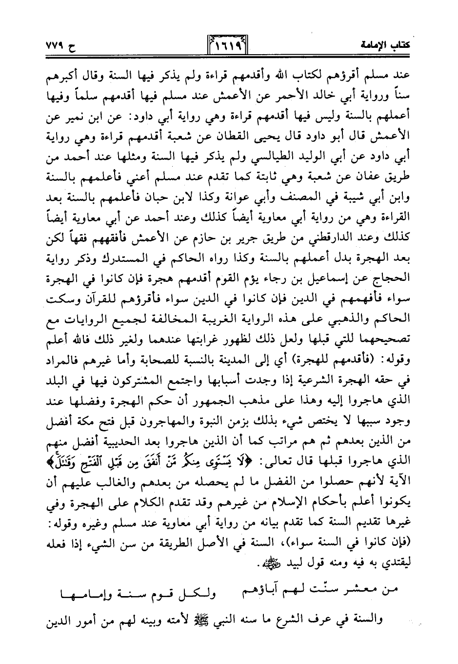 عند مسلم أقرؤهم لكتاب الله وأقدمهم قراءة ولم يذكر فيها السنة وقال أكبرهم سنًا ورواية أبي خالد الأحمر عن الأعمش عند مسلم فيها أقدمهم سلمًا وفيها أعملهم بالسنة وليس فيها أقدمهم قراءة وهي رواية أبي داود: عن ابن نمير عن الأعمش قال أبو داود قال يحيى القطان عن شعبة أقدمهم قراءة وهي رواية أبي داود عن أبي الوليد الطيالسي ولم يذكر فيها السنة ومثلها عند أحمد من طريق عفان عن شعبة وهي ثابتة كما تقدم عند مسلم أعني فأعلمهم بالسنة وابن أبي شيبة في المصنف وأبي عوانة وكذا لابن حبان فأعلمهم بالسنة بعد القراءة وهي من رواية أبي معاوية أيضًا كذلك وعند أحمد عن أبي معاوية أيضًا كذلك وعند الدارقطني من طريق جرير بن حازم عن الأعمش فأفقههم فقهًا لكن بعد الهجرة بدل أعلمهم بالسنة وكذا رواه الحاكم في المستدرك وذكر رواية الحجاج عن إسماعيل بن رجاء يؤم القوم أقدمهم هجرة فإن كانوا في الهجرة سواء فأفهمهم في الدين فإن كانوا في الدين سواء فأقرؤهم للقرآن وسكت الحاكم والذهبي على هذه الرواية الغريبة المخالفة لجميع الروايات مع تصحيحهما للتي قبلها ولعل ذلك لظهور غرابتها عندهما ولغير ذلك فالله أعلم وقوله: (فأقدمهم للهجرة) أي إلى المدينة بالنسبة للصحابة وأما غيرهم فالمراد في حقه الهجرة الشرعية إذا وجدت أسبابها واجتمع المشتركون فيها في البلد الذي هاجروا إليه وهذا على مذهب الجمهور أن حكم الهجرة وفضلها عند وجود سببها لا يختص شيء بذلك بزمن النبوة والمهاجرون قبل فتح مكة أفضل من الذين بعدهم ثم هم مراتب كما أن الذين هاجروا بعد الحديبية أفضل منهم الذي هاجروا قبلها قال تعالى: {لَا يَسْتَوِي مِنْكُمْ مَنْ أَنْفَقَ مِنْ قَبْلِ الْفَتْحِ وَقَاتَلَ} الآية لأنهم حصلوا من الفضل ما لم يحصله من بعدهم والغالب عليهم أن يكونوا أعلم بأحكام الإِسلام من غيرهم وقد تقدم الكلام على الهجرة وفي غيرها تقديم السنة كما تقدم بيانه من رواية أبي معاوية عند مسلم وغيره وقوله: (فإن كانوا في السنة سواء)، السنة في الأصل الطريقة من سن الشيء إذا فعله ليقتدي به فيه ومنه قول لبيد - رضي الله عنه -.