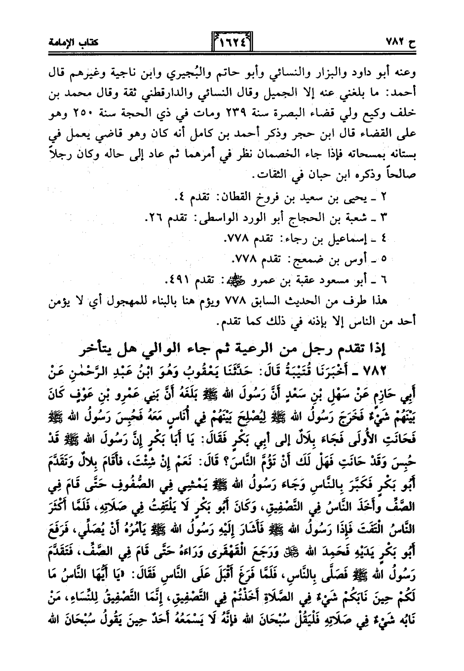 782 - أَخْبَرَنَا قُتَيْبَةُ قَالَ: حَدَّثَنَا يَعْقُوبُ وَهُوَ ابْنُ عَبْدِ الرَّحْمَنِ عَنْ أَبِي حَازِمٍ عَنْ سَهْلِ بْنِ سَعْدٍ أَنَّ رَسُولَ اللَّهِ - صلى الله عليه وسلم - بَلَغَهُ أَنَّ بَنِي عَمْرِو بْنِ عَوْفٍ كَانَ بَيْنَهُمْ شَيْءٌ فَخَرَجَ رَسُولُ اللَّهِ - صلى الله عليه وسلم - لِيُصْلِحَ بَيْنَهُمْ فِي أُنَاسٍ مَعَهُ فَحُبِسَ رَسُولُ اللَّهِ - صلى الله عليه وسلم - فَحَانَتِ الأُولَى فَجَاءَ بِلَالٌ إِلَى أَبِي بَكْرٍ فَقَالَ: يَا أَبَا بَكْرٍ إِنَّ رَسُولَ اللَّهِ - صلى الله عليه وسلم - قَدْ حُبِسَ وَقَدْ حَانَتِ الصَّلَاةُ فَهَلْ لَكَ أَنْ تَؤُمَّ النَّاسَ؟ قَالَ: نَعَمْ إِنْ شِئْتَ، فَأَقَامَ بِلَالٌ وَتَقَدَّمَ أَبُو بَكْرٍ فَكَبَّرَ بِالنَّاسِ وَجَاءَ رَسُولُ اللَّهِ - صلى الله عليه وسلم - يَمْشِي فِي الصُّفُوفِ حَتَّى قَامَ فِي الصَّفِّ وَأَخَذَ النَّاسُ فِي التَّصْفِيقِ، وَكَانَ أَبُو بَكْرٍ لَا يَلْتَفِتُ فِي صَلَاتِهِ، فَلَمَّا أَكْثَرَ النَّاسُ الْتَفَتَ فَإِذَا رَسُولُ اللَّهِ - صلى الله عليه وسلم - فَأَشَارَ إِلَيْهِ رَسُولُ اللَّهِ - صلى الله عليه وسلم - يَأْمُرُهُ أَنْ يُصَلِّيَ، فَرَفَعَ أَبُو بَكْرٍ يَدَيْهِ فَحَمِدَ اللَّهَ -عَزَّ وَجَلَّ- وَرَجَعَ الْقَهْقَرَي وَرَاءَهُ حَتَّى قَامَ فِي الصَّفِّ، فَتَقَدَّمَ رَسُولُ اللَّهِ - صلى الله عليه وسلم - فَصَلَّى بِالنَّاسِ، فَلَمَّا فَرَغَ أَقْبَلَ عَلَى النَّاسِ فَقَالَ: "يَا أَيُّهَا النَّاسُ مَا لَكُمْ حِينَ نَابَكُمْ شَيْءٌ فِي الصَّلَاةِ أَخَذْتُمْ فِي التَّصْفِيقِ، إِنَّمَا التَّصْفِيقُ لِلنِّسَاءِ، مَنْ نَابَهُ شَيْءٌ فِي صَلَاتِهِ فَلْيَقُلْ سُبْحَانَ اللَّهِ فَإِنَّهُ لَا يَسْمَعُهُ أَحَدٌ حِينَ يَقُولُ سُبْحَانَ اللَّهِ