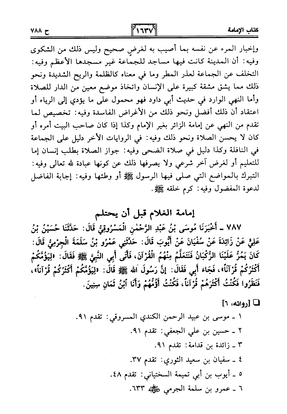 787 - أَخْبَرَنَا مُوسَى بْنُ عَبْدِ الرَّحْمَنِ الْمَسْرُوقِيُّ قال: حَدَّثَنَا حُسَيْنُ بْنُ عَلِيٍّ عَنْ زَائِدَةَ عَنْ سُفْيَانَ عَنْ أَيُّوبَ قَالَ: حَدَّثَنِي عَمْرُو بْنُ سَلِمَةَ الْجَرْمِيُّ قَالَ: كَانَ يَمُرُّ عَلَيْنَا الرُّكْبَانُ فَنَتَعَلَّمُ مِنْهُمُ الْقُرْآنَ، فَأَتَى أَبِي النَّبِيَّ - صلى الله عليه وسلم - فَقَالَ: "لِيَؤُمَّكُمْ أَكْثَرُكُمْ قُرْآنًا"، فَجَاءَ أَبِي فَقَالَ: إِنَّ رَسُولَ اللَّهِ - صلى الله عليه وسلم - قَالَ: "لِيَؤُمَّكُمْ أَكْثَرُكُمْ قُرْآنًا"، فَنَظَرُوا فَكُنْتُ أَكْثَرَهُمْ قُرْآنًا، فَكُنْتُ أَؤُمُّهُمْ وَأَنَا ابْنُ ثَمَانِ سِنِينَ.