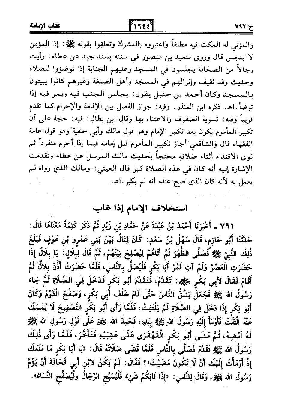 791 - أَخْبَرَنَا أَحْمَدُ بْنُ عَبْدَةَ عَنْ حَمَّادِ بْنِ زَيْدٍ ثُمَّ ذَكَرَ كَلِمَةً مَعْنَاهَا قَالَ: حَدَّثَنَا أَبُو حَازِمٍ، قَالَ سَهْلُ بْنُ سَعْدٍ: كَانَ قِتَالٌ بَيْنَ بَنِي عَمْرِو بْنِ عَوْفٍ فَبَلَغَ ذَلِكَ النَّبِيَّ - صلى الله عليه وسلم - فَصَلَّى الظُّهْرَ ثُمَّ أَتَاهُمْ لِيُصْلِحَ بَيْنَهُمْ، ثُمَّ قَالَ لِبِلَالٍ: يَا بِلَالُ إِذَا حَضَرَت الْعَصْرُ وَلَمْ آتِ فَمُرْ أَبَا بَكْرٍ فَلْيُصَلِّ بِالنَّاسِ، فَلَمَّا حَضَرَتْ أَذَّنَ بِلَالٌ ثُمَّ أَقَامَ فَقَالَ لأَبِي بَكْرٍ - رضي الله عنه -: تَقَدَّمْ، فَتَقَدَّمَ أَبُو بَكْرٍ فَدَخَلَ فِي الصَّلَاةِ ثُمَّ جَاءَ رَسُولُ اللَّهِ - صلى الله عليه وسلم - فَجَعَلَ يَشُقُّ النَّاسَ حَتَّى قَامَ خَلْفَ أَبِي بَكْرٍ، وَصَفَّحَ الْقَوْمُ وَكَانَ أَبُو بَكْرٍ إِذَا دَخَلَ فِي الصَّلَاةِ لَمْ يَلْتَفِتْ، فَلَمَّا رَأَى أَبُو بَكْرٍ التَّصْفِيحَ لَا يُمْسَكُ عَنْهُ الْتَفَتَ فَأَوْمَأَ إِلَيْهِ رَسُولُ اللَّهِ - صلى الله عليه وسلم - بِيَدِهِ، فَحَمِدَ اللَّهَ -عَزَّ وَجَلَّ- عَلَى قَوْلِ رَسُولِ اللَّهِ - صلى الله عليه وسلم - لَهُ امْضِهْ، ثُمَّ مَشَى أَبُو بَكْرٍ الْقَهْقَرَى عَلَى عَقِبَيْهِ فَتَأَخَّرَ، فَلَمَّا رَأَى ذَلِكَ رَسُولُ اللَّهِ - صلى الله عليه وسلم - تَقَدَّمَ فَصَلَّى بِالنَّاسِ فَلَمَّا قَضَى صَلَاتَهُ قَالَ: "يَا أَبَا بَكْرٍ مَا مَنَعَكَ إِذْ أَوْمَأْتُ إِلَيْكَ أَنْ لَا تَكُونَ مَضَيْتَ"؟ فَقَالَ: لَمْ يَكُنْ لاِبْنِ أَبِي قُحَافَةَ أَنْ يَؤُمَّ رَسُولَ اللَّهِ - صلى الله عليه وسلم -، وَقَالَ لِلنَّاسِ: "إِذَا نَابَكُمْ شَيْءٌ فَلْيُسَبِّحِ الرِّجَالُ وَلْيُصَفِّحِ النِّسَاءُ".
