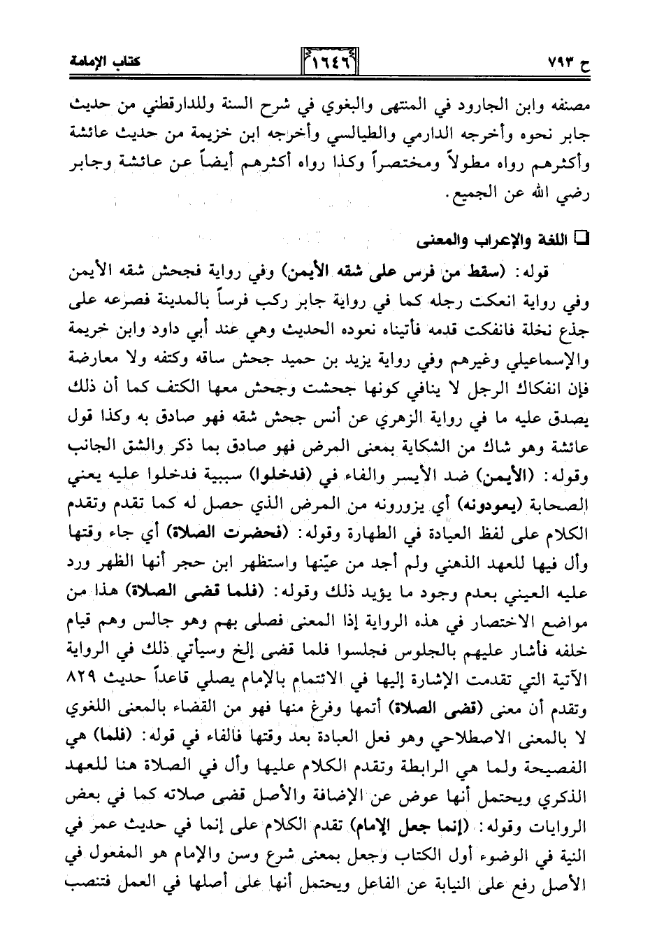 قوله: (سقط من فرس على شقه الأيمن) وفي رواية فجحش شقه الأيمن وفي رواية انعكت رجله كما في رواية جابر ركب فرسًا بالمدينة فصرعه على جذع نخلة فانفكت قدمه فأتيناه نعوده الحديث وهي عند أبي داود وابن خريمة والإسماعيلي وغيرهم وفي رواية يزيد بن حميد جحش ساقه وكتفه ولا معارضة فإن انفكاك الرجل لا ينافي كونها جحشت وجحش معها الكتف كما أن ذلك يصدق عليه ما في رواية الزهري عن أنس جحش شقه فهو صادق به وكذا قول عائشة وهو شاك من الشكاية بمعنى المرض فهو صادق بما ذكر والشق الجانب وقوله: (الأيمن) ضد الأيسر والفاء في (فدخلوا) سببية فدخلوا عليه يعني الصحابة (يعودونه) أي يزورونه من المرض الذي حصل له كما تقدم وتقدم الكلام على لفظ العيادة في الطهارة وقوله: (فحضرت الصلاة) أي جاء وقتها وأل فيها للعهد الذهني ولم أجد من عيّنها واستظهر ابن حجر أنها الظهر ورد عليه العيني بعدم وجود ما يؤيد ذلك وقوله: (فلما قضى الصلاة) هذا من مواضع الاختصار في هذه الرواية إذا المعنى فصلى بهم وهو جالس وهم قيام خلفه فأشار عليهم بالجلوس فجلسوا فلما قضى إلخ وسيأتي ذلك في الرواية الآتية التي تقدمت الإشارة إليها في الائتمام بالإمام يصلي قاعدًا حديث 829 وتقدم أن معنى (قضى الصلاة) أتمها وفرغ منها فهو من القضاء بالمعنى اللغوي لا بالمعنى الاصطلاحي وهو فعل العبادة بعد وقتها فالفاء في قوله: (فلما) هي الفصيحة ولما هي الرابطة وتقدم الكلام عليها وأل في الصلاة هنا للعهد الذكري ويحتمل أنها عوض عن الإضافة والأصل قضى صلاته كما في بعض الروايات وقوله: (إنما جعل الإمام) تقدم الكلام على إنما في حديث عمر في النية في الوضوء أول الكتاب وجعل بمعنى شرع وسن والإمام هو المفعول في الأصل رفع على النيابة عن الفاعل ويحتمل أنها على أصلها في العمل فتنصب