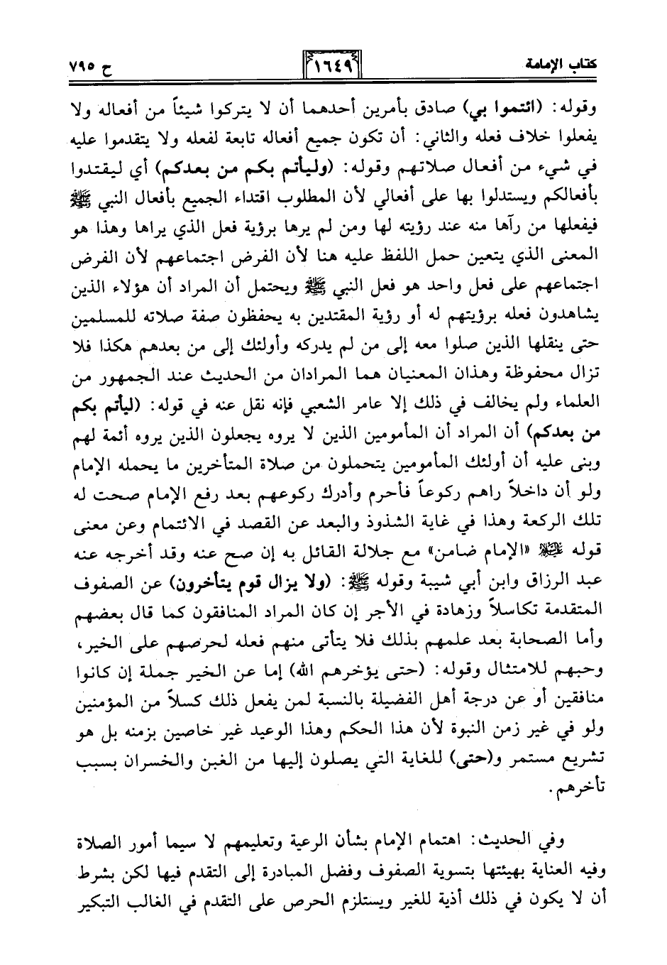 وقوله: (ائتموا بي) صادق بأمرين أحدهما أن لا يتركوا شيئًا من أفعاله ولا يفعلوا خلاف فعله والثاني: أن تكون جميع أفعاله تابعة لفعله ولا يتقدموا عليه في شيء من أفعال صلاتهم وقوله: (وليأتم بكم من بعدكم) أي ليقتدوا بأفعالكم ويستدلوا بها على أفعالي لأن المطلوب اقتداء الجميع بأفعال النبي - صلى الله عليه وسلم - فيفعلها من رآها منه عند رؤيته لها ومن لم يرها برؤية فعل الذي يراها وهذا هو المعنى الذي يتعين حمل اللفظ عليه هنا لأن الفرض اجتماعهم لأن الفرض اجتماعهم على فعل واحد هو فعل النبي - صلى الله عليه وسلم - ويحتمل أن المراد أن هؤلاء الذين يشاهدون فعله برؤيتهم له أو رؤية المقتدين به يحفظون صفة صلاته للمسلمين حتى ينقلها الذين صلوا معه إلى من لم يدركه وأولئك إلى من بعدهم هكذا فلا تزال محفوظة وهذان المعنيان هما المرادان من الحديث عند الجمهور من العلماء ولم يخالف في ذلك إلا عامر الشعبي فإنه نقل عنه في قوله: (ليأتم بكم من بعدكم) أن المراد أن المأمومين الذين لا يروه يجعلون الذين يروه أئمة لهم وبنى عليه أن أولئك المأمومين يتحملون من صلاة المتأخرين ما يحمله الإمام ولو أن داخلًا رآهم ركوعًا فأحرم وأدرك ركوعهم بعد رفع الإمام صحت له تلك الركعة وهذا في غاية الشذوذ والبعد عن القصد في الائتمام وعن معنى قوله -عليه السلام- "الإمام ضامن" مع جلالة القائل به إن صح عنه وقد أخرجه عنه عبد الرزاق وابن أبي شيبة وقوله - صلى الله عليه وسلم -: (ولا يزال قوم يتأخرون) عن الصفوف المتقدمة تكاسلا وزهادة في الأجر إن كان المراد المنافقون كما قال بعضهم وأما الصحابة بعد علمهم بذلك فلا يتأتى منهم فعله لحرصهم على الخير، وحبهم للامتثال وقوله: (حتى يؤخرهم الله) إما عن الخير جملة إن كانوا منافقين أو عن درجة أهل الفضيلة بالنسبة لمن يفعل ذلك كسلًا من المؤمنين ولو في غير زمن النبوة لأن هذا الحكم وهذا الوعيد غير خاصين بزمنه بل هو تشريع مستمر و (حتى) للغاية التي يصلون إليها من الغبن والخسران بسبب تأخرهم.