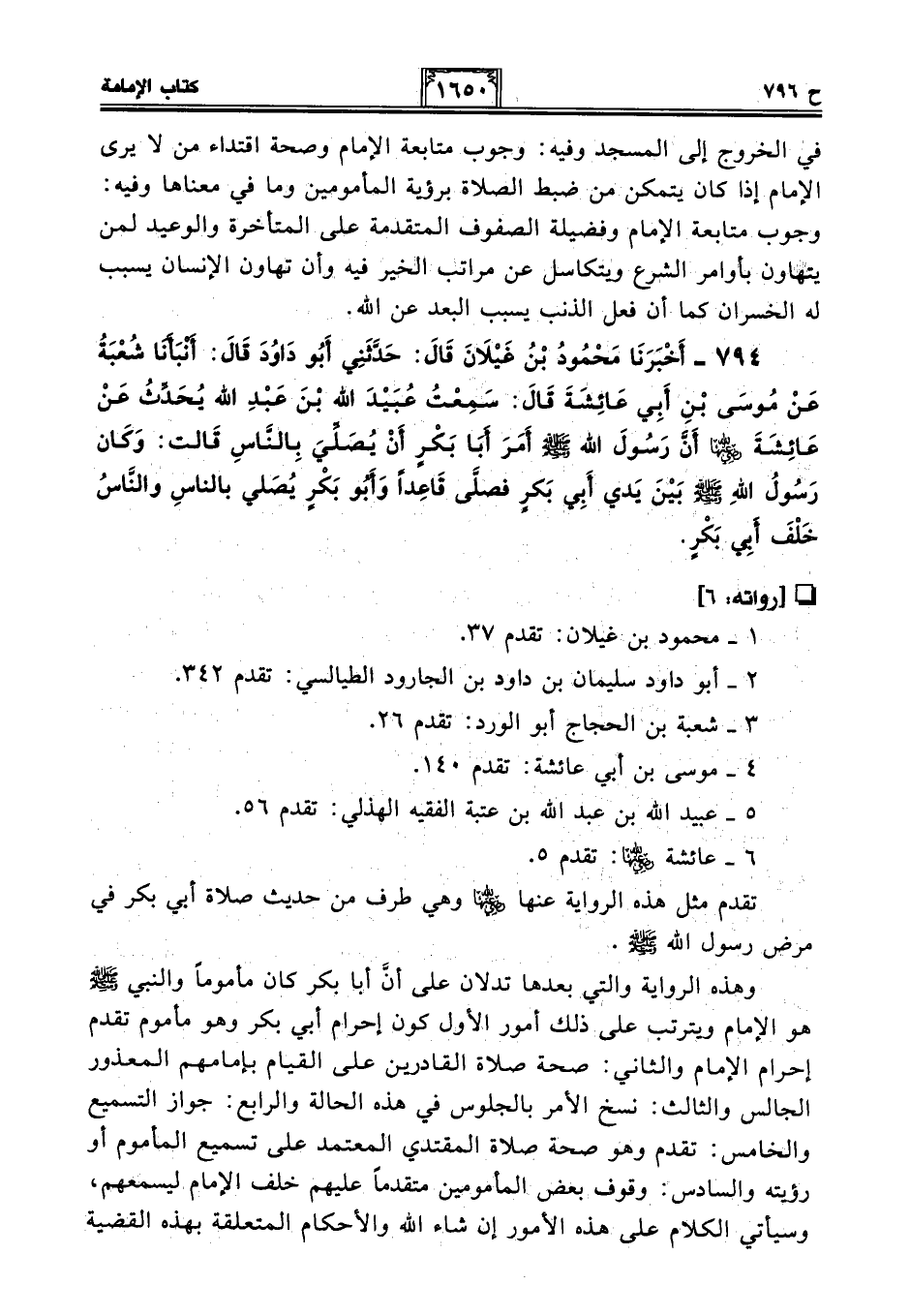 794 - أَخْبَرَنَا مَحْمُودُ بْنُ غَيْلَانَ قَالَ: حَدَّثَنِي أَبُو دَاوُدَ قَالَ: أَنْبَأَنَا شُعْبَةُ عَنْ مُوسَى بْنِ أَبِي عَائِشَةَ قَالَ: سَمِعْتُ عُبَيْدَ اللَّهِ بْنَ عَبْدِ اللَّهِ يُحَدِّثُ عَنْ عَائِشَةَ -رضي الله عنها- أَنَّ رَسُولَ اللَّهِ - صلى الله عليه وسلم - أَمَرَ أَبَا بَكْرٍ أَنْ يُصَلِّيَ بِالنَّاسِ قَالَتْ: وَكَانَ رسول الله - صلى الله عليه وسلم - بَيْنَ يَدَيْ أَبِي بَكْرٍ فَصَلَّى قَاعِدًا وَأَبُو بَكْرٍ يُصَلِّي بِالنَّاسِ وَالنَّاسُ خَلْفَ أَبِي بَكْرٍ.