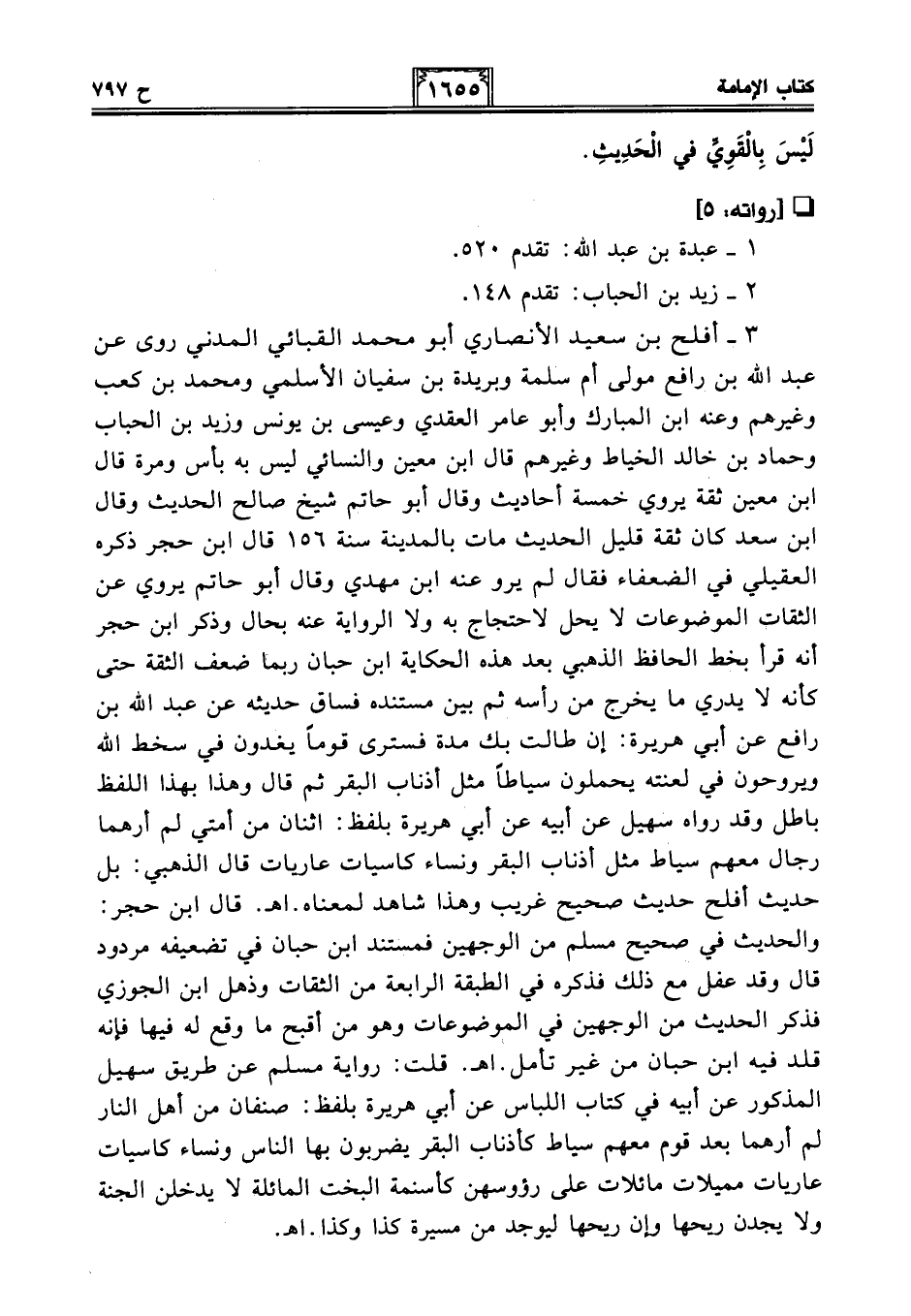 3 - أفلح بن سعيد الأنصاري أبو محمد القبائي المدني روى عن عبد الله بن رافع مولى أم سلمة وبريدة بن سفيان الأسلمي ومحمد بن كعب وغيرهم وعنه ابن المبارك وأبو عامر العقدي وعيسى بن يونس وزيد بن الحباب وحماد بن خالد الخياط وغيرهم قال ابن معين والنسائي ليس به بأس ومرة قال ابن معين ثقة يروي خمسة أحاديث وقال أبو حاتم شيخ صالح الحديث وقال ابن سعد كان ثقة قليل الحديث مات بالمدينة سنة 156 قال ابن حجر ذكره العقيلي في الضعفاء فقال لم يرو عنه ابن مهدي وقال أبو حاتم يروي عن الثقات الموضوعات لا يحل لاحتجاج به ولا الرواية عنه بحال وذكر ابن حجر أنه قرأ بخط الحافظ الذهبي بعد هذه الحكاية ابن حبان ربما ضعف الثقة حتى كأنه لا يدري ما يخرج من رأسه ثم بين مستنده فساق حديثه عن عبد الله بن رافع عن أبي هريرة: إن طالت بك مدة فسترى قوما يغدون في سخط الله ويروحون في لعنته يحملون سياطا مثل أذناب البقر ثم قال وهذا بهذا اللفظ باطل وقد رواه سهيل عن أبيه عن أبي هريرة بلفظ: اثنان من أمتي لم أرهما رجال معهم سياط مثل أذناب البقر ونساء كاسيات عاريات قال الذهبي: بل حديث أفلح حديث صحيح غريب وهذا شاهد لمعناه. اهـ. قال ابن حجر: والحديث في صحيح مسلم من الوجهين فمستند ابن حبان في تضعيفه مردود قال وقد غفل مع ذلك فذكره في الطبقة الرابعة من الثقات وذهل ابن الجوزي فذكر الحديث من الوجهين في الموضوعات وهو من أقبح ما وقع له فيها فإنه قلد فيه ابن حبان من غير تأمل. اهـ. قلت: رواية مسلم عن طريق سهيل المذكور عن أبيه في كتاب اللباس عن أبي هريرة بلفظ: صنفان من أهل النار لم أرهما بعد قوم معهم سياط كأذناب البقر يضربون بها الناس ونساء كاسيات عاريات مميلات مائلات على رؤوسهن كأسنمة البخت المائلة لا يدخلن الجنة ولا يجدن ريحها وإن ريحها ليوجد من مسيرة كذا وكذا. اهـ.