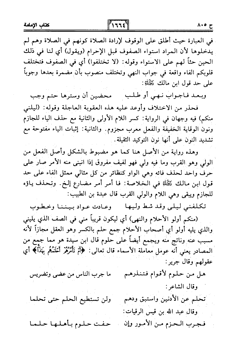 (منكم أولو الأحلام والنهى) أي ليكون قريبا مني في الصف الذي يليني والذي يليه أولو أي أصحاب الأحلام جمع حلم بالكسر وهو العقل مجازًا لأنه مسبب عنه وناتج منه ويجمع أيضًا على حلوم قال ابن سيدة هو مما جمع من المصادر يعني أنه عومل معاملة الأسماء قال تعالى: {أَمْ تَأْمُرُهُمْ أَحْلَامُهُمْ بِهَذَا} أي عقولهم وقال جرير: