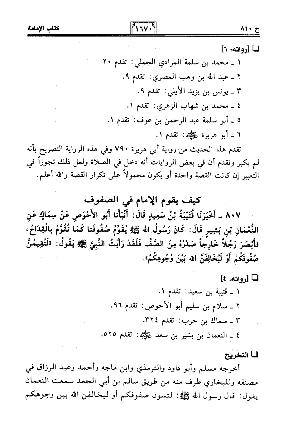 807 - أَخْبَرَنَا قُتَيْبَةُ بْنُ سَعِيدٍ قَالَ: أَنْبَأَنَا أَبُو الأَحْوَصِ عَنْ سِمَاكٍ عَنِ النُّعْمَانِ بْنِ بَشِيرٍ قَالَ: كَانَ رَسُولُ اللَّهِ - صلى الله عليه وسلم - يُقَوِّمُ صُفُوفَنا كَمَا تُقَوَّمُ بالْقِدَاحُ، فَأَبْصَرَ رَجُلًا خَارِجًا صَدْرُهُ مِنَ الصَّفِّ فَلَقَدْ رَأَيْتُ النَّبِيَّ - صلى الله عليه وسلم - يَقُولُ: "لَتُقِيمُنَّ صُفُوفَكُمْ أَوْ لَيُخَالِفَنَّ اللَّهُ بَيْنَ وُجُوهِكُمْ".