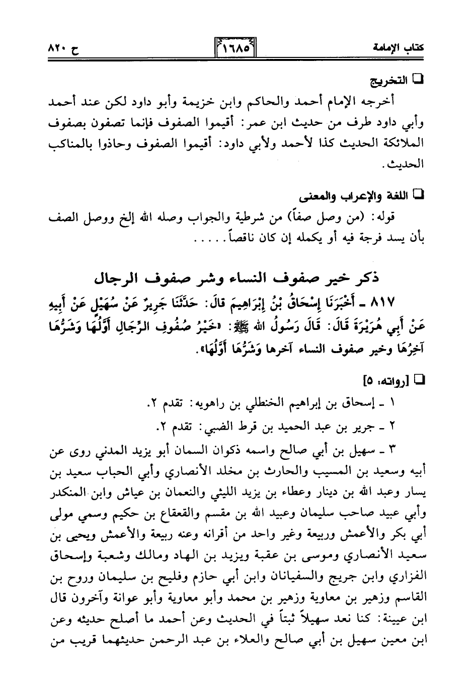 أخرجه الإمام أحمد والحاكم وابن خزيمة وأبو داود لكن عند أحمد وأبي داود طرف من حديث ابن عمر: أقيموا الصفوف فإنما تصفون بصفوف الملائكة الحديث كذا لأحمد ولأبي داود: أقيموا الصفوف وحاذوا بالمناكب الحديث.