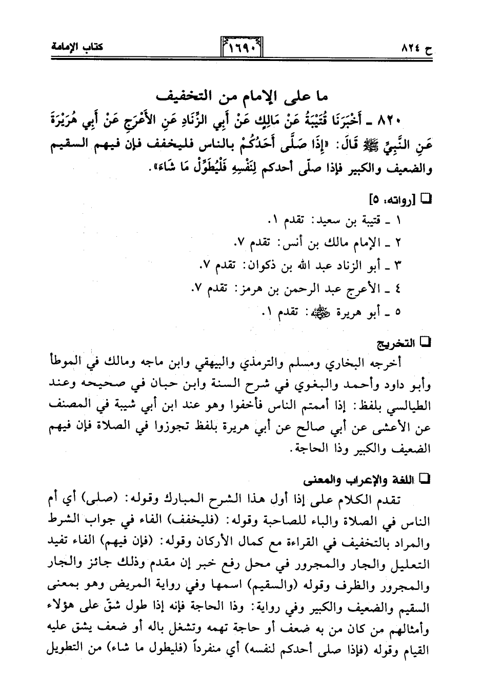 أخرجه البخاري ومسلم والترمذي والبيهقي وابن ماجه ومالك في الموطأ وأبو داود وأحمد والبغوي في شرح السنة وابن حبان في صحيحه وعند الطيالسي بلفظ: إذا أممتم الناس فأخفوا وهو عند ابن أبي شيبة في المصنف عن الأعشى عن أبي صالح عن أبي هريرة بلفظ تجوزوا في الصلاة فإن فيهم الضعيف والكبير وذا الحاجة.