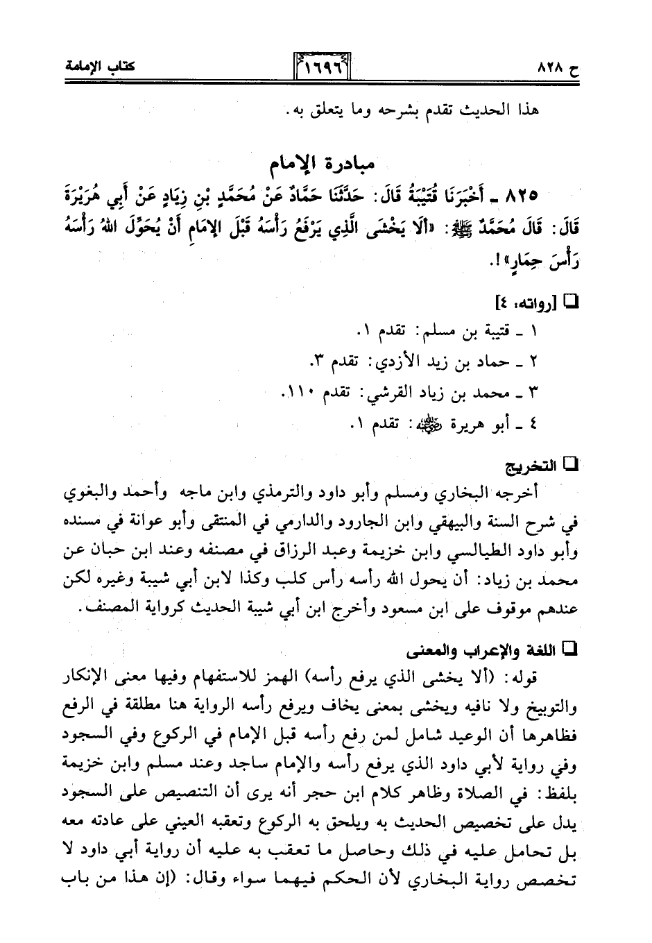 825 - أَخْبَرَنَا قُتَيْبَةُ قَالَ: حَدَّثَنَا حَمَّادٌ عَنْ مُحَمَّدِ بْنِ زِيَادٍ عَنْ أَبِي هُرَيْرَةَ قَالَ: قَالَ مُحَمَّدٌ - صلى الله عليه وسلم -: "أَلَا يَخْشَى الَّذِي يَرْفَعُ رَأْسَهُ قَبْلَ الإِمَامِ أَنْ يُحَوِّلَ اللَّهُ رَأْسَهُ رَأْسَ حِمَارٍ"! .