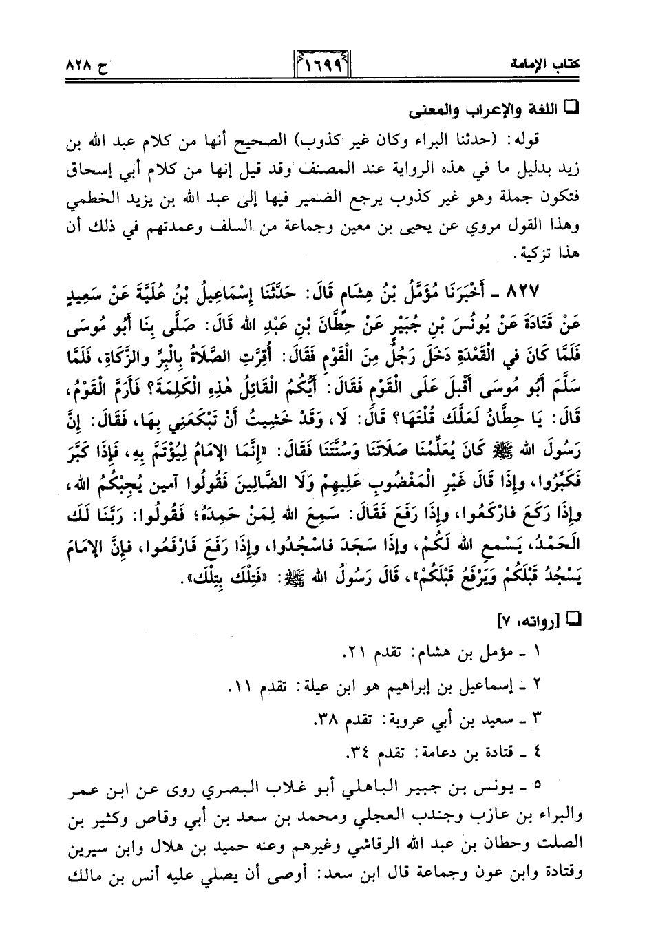 827 - أَخْبَرَنَا مُؤَمَّلُ بْنُ هِشَامٍ قَالَ: حَدَّثَنَا إِسْمَاعِيلُ ابْنُ عُلَيَّةَ عَنْ سَعِيدٍ عَنْ قَتَادَةَ عَنْ يُونُسَ بْنِ جُبَيْرٍ عَنْ حِطَّانَ بْنِ عَبْدِ اللَّهِ قَالَ: صَلَّى بِنَا أَبُو مُوسَى فَلَمَّا كَانَ فِي الْقَعْدَةِ دَخَلَ رَجُلٌ مِنَ الْقَوْمِ فَقَالَ: أُقِرَّتِ الصَّلَاةُ بِالْبِرِّ وَالزَّكَاةِ، فَلَمَّا سَلَّمَ أَبُو مُوسَى أَقْبَلَ عَلَى الْقَوْمِ فَقَالَ: أَيُّكُمُ الْقَائِلُ هَذِهِ الْكَلِمَةَ؟ فَأَرَمَّ الْقَوْمُ، قَالَ: يَا حِطَّانُ لَعَلَّكَ قُلْتَهَا؟ قَالَ: لَا، وَقَدْ خَشِيتُ أَنْ تَبْكَعَنِي بِهَا، فَقَالَ: إِنَّ رَسُولَ اللَّهِ - صلى الله عليه وسلم - كَانَ يُعَلِّمُنَا صَلَاتَنَا وَسُنَّتَنَا فَقَالَ: "إِنَّمَا الإِمَامُ لِيُؤْتَمَّ بِهِ، فَإِذَا كَبَّرَ فَكَبِّرُوا، وَإِذَا قَالَ غَيْرِ الْمَغْضُوبِ عَلَيْهِمْ وَلَا الضَّالِّينَ فَقُولُوا آمِينَ يُجِبْكُمُ اللَّهُ، وَإِذَا رَكَعَ فَارْكَعُوا، وَإِذَا رَفَعَ فَقَالَ: سَمِعَ اللَّهُ لِمَنْ حَمِدَهُ؛ فَقُولُوا: رَبَّنَا لَكَ الْحَمْدُ، يَسْمَعِ اللَّهُ لَكُمْ، وَإِذَا سَجَدَ فَاسْجُدُوا، وَإِذَا رَفَعَ فَارْفَعُوا، فَإِنَّ الإِمَامَ يَسْجُدُ قَبْلَكُمْ وَيَرْفَعُ قَبْلَكُمْ"، قَالَ رَسُولُ اللَّهِ - صلى الله عليه وسلم -: "فَتِلْكَ بِتِلْكَ".