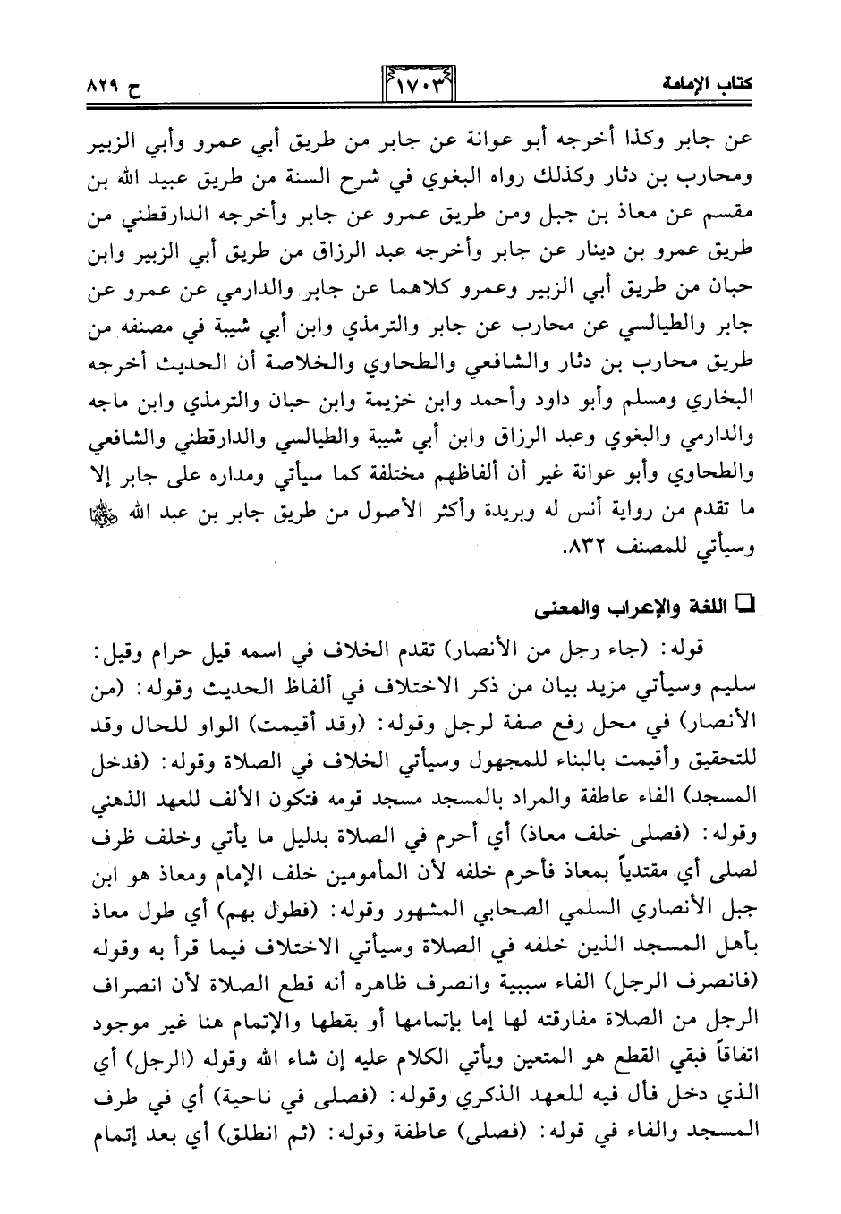 عن جابر وكذا أخرجه أبو عوانة عن جابر من طريق أبي عمرو وأبي الزبير ومحارب بن دثار وكذلك رواه البغوي في شرح السنة من طريق عبيد الله بن مقسم عن معاذ بن جبل ومن طريق عمرو عن جابر وأخرجه الدارقطني من طريق عمرو بن دينار عن جابر وأخرجه عبد الرزاق من طريق أبي الزبير وابن حبان من طريق أبي الزبير وعمرو كلاهما عن جابر والدارمي عن عمرو عن جابر والطيالسي عن محارب عن جابر والترمذي وابن أبي شيبة في مصنفه من طريق محارب بن دثار والشافعي والطحاوي والخلاصة أن الحديث أخرجه البخاري ومسلم وأبو داود وأحمد وابن خزيمة وابن حبان والترمذي وابن ماجه والدارمي والبغوي وعبد الرزاق وابن أبي شيبة والطيالسي والدارقطني والشافعي والطحاوي وأبو عوانة غير أن ألفاظهم مختلفة كما سيأتي ومداره على جابر إلا ما تقدم من رواية أنس له وبريدة وأكثر الأصول من طريق جابر بن عبد الله -رضي الله عنهما- وسيأتي للمصنف 832.